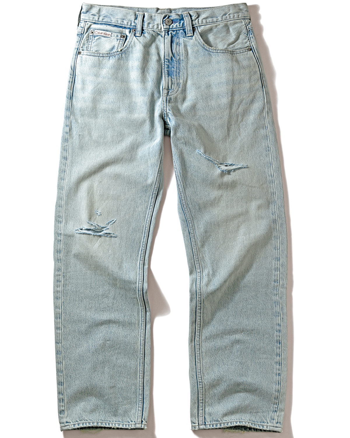 ヒップや太腿はストレートフィットで、膝下はルースな〝’90s ストレート マイゼル〞。前腿のダメージも、グランジっぽくていい感じ。2万7500円(カルバン・クライン/カルバン・クライン カスタマーサービス)
