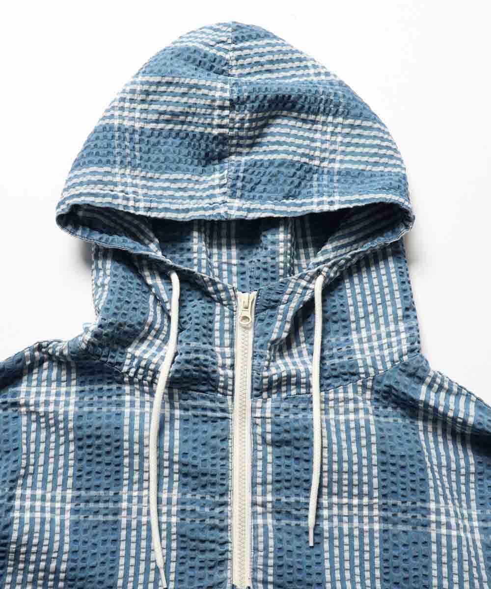 『Safari Lounge』がブランドに別注したシャツパーカ。首元に開放感を出せるハーフジップのアノラック型で、プルオーバーよりもウエア内の温度調節がしやすいのが大きなメリット。生地にはインディゴ糸を用いたシアサッカー素材を採用。青×白のチェック柄が爽やかなアメカジムードを演出しつつ、シアサッカーならではのドライなタッチが汗ばむ季節の不快感をゼロにしてくれる。ゆったりと羽織れるリラックス感のあるシルエットで、大人の休日にふさわしい肩の力の抜けたスタイルを約束してくれる1着。