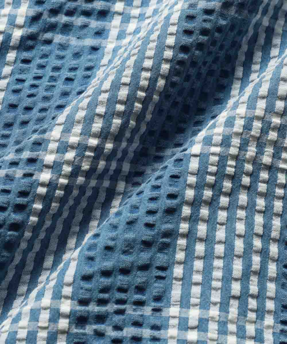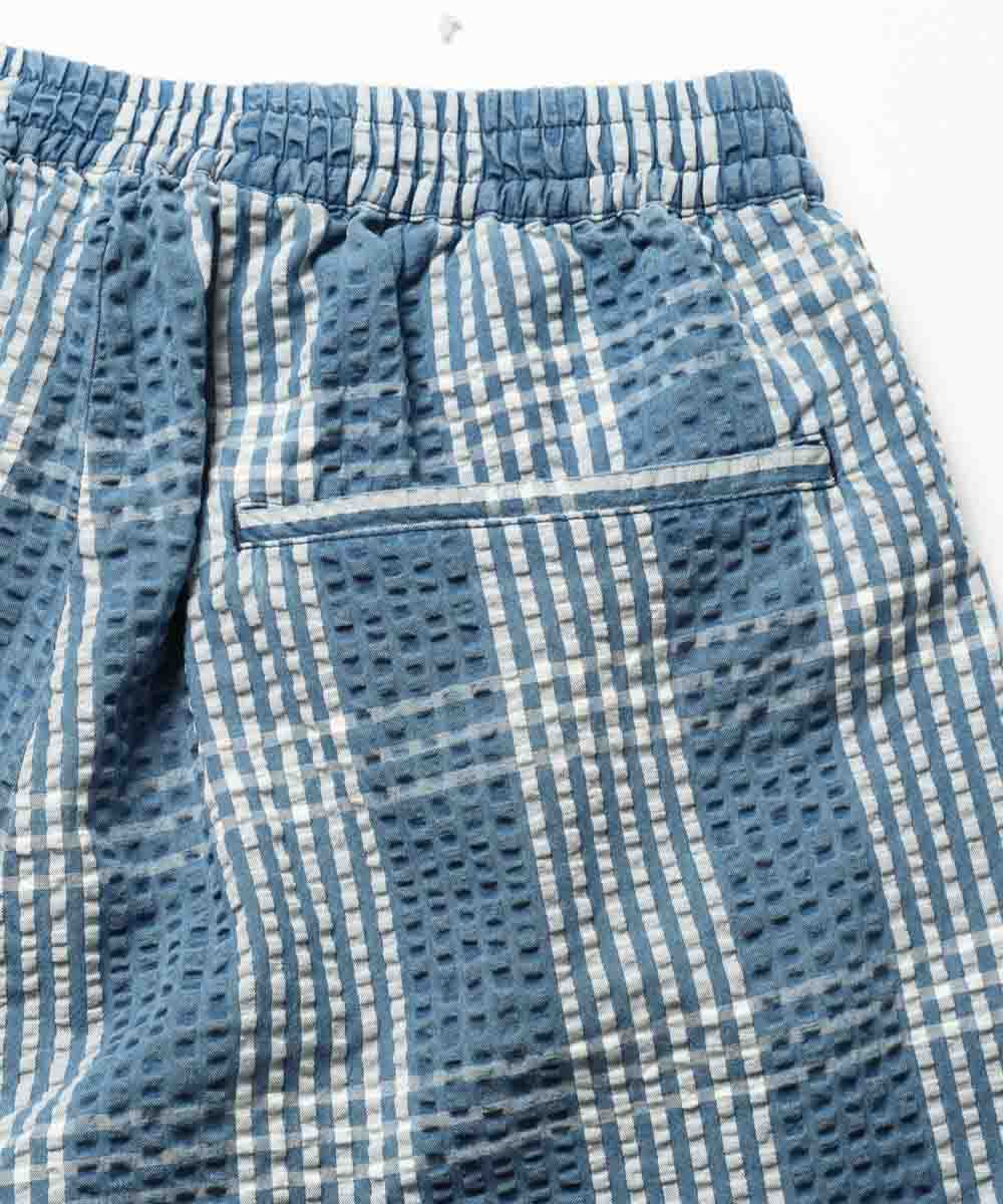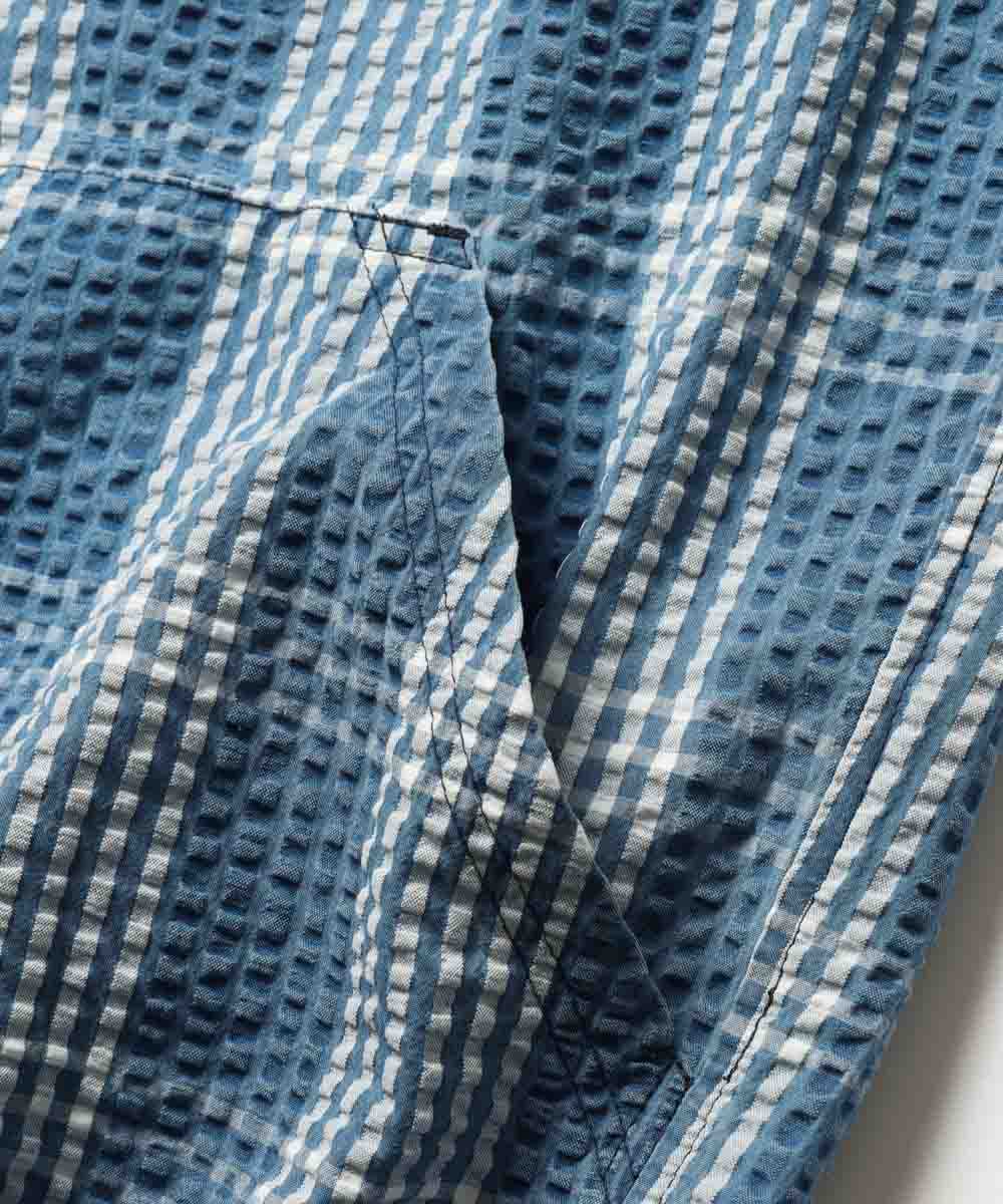 シャツパーカと同素材で仕立てられたシアサッカーショーツは、春先はロンTや薄手のスウェットと合わせて、夏本番になればTシャツ1枚と合わせるだけで、涼しげでこなれた西海岸スタイルが完成。最大の魅力は、やはりシアサッカー特有の波打つような生地の凹凸。ジメジメとした日や気温が上がる日でもベタつかず、常にサラサラとした極上の穿き心地をキープしてくれるのが嬉しい。青×白のチェック柄とブリーチによる褪せ色が、リゾート感とアメカジの土臭さを絶妙なバランスで両立した、まさに大人のための1本だ。