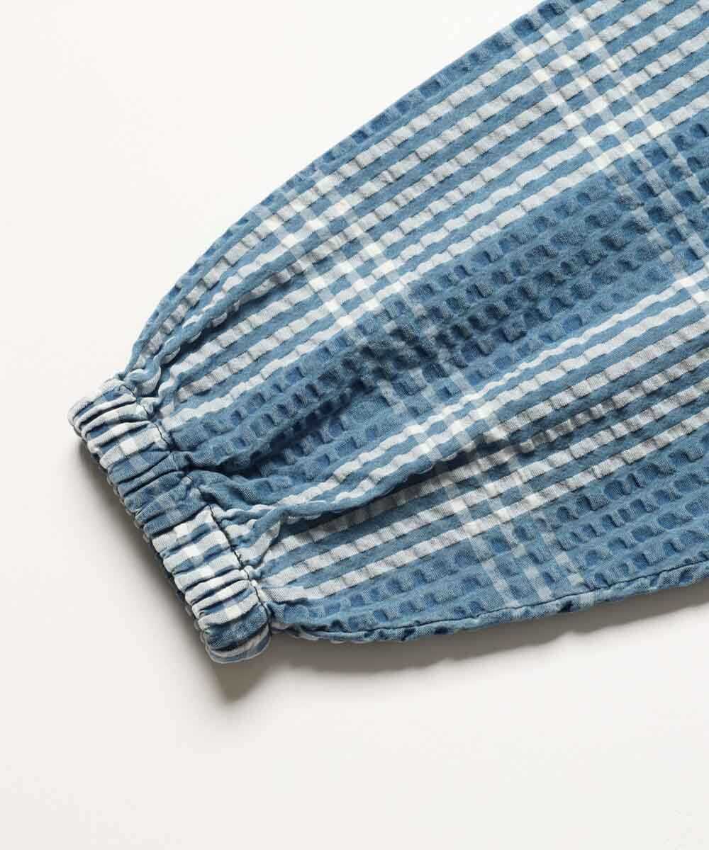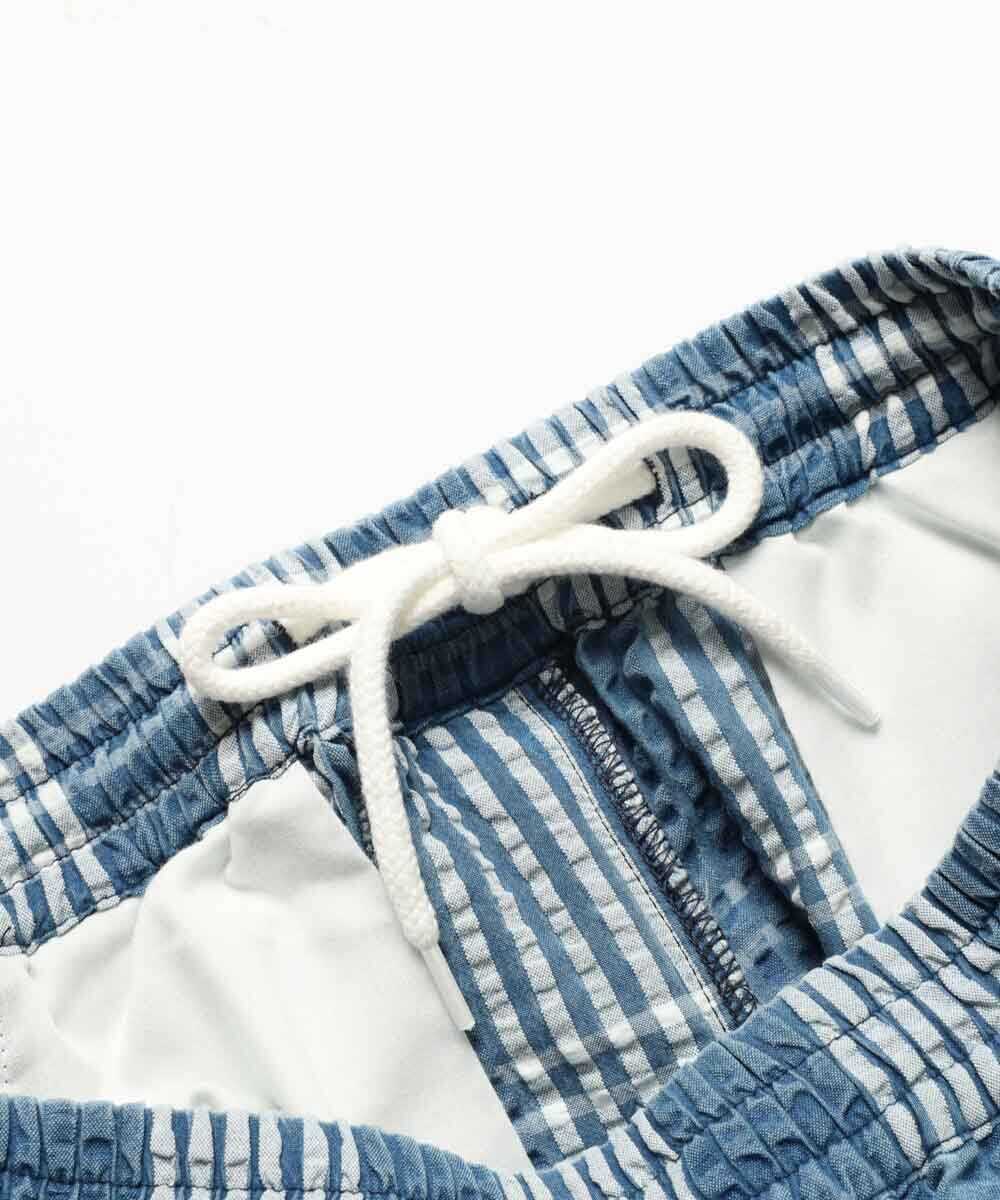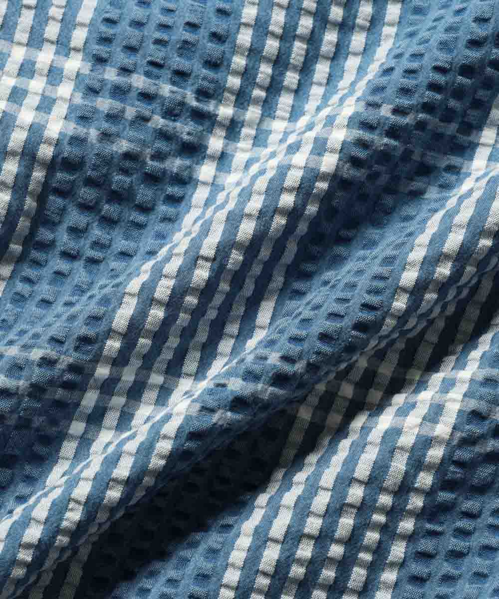 シャツパーカと同素材で仕立てられたシアサッカーショーツは、春先はロンTや薄手のスウェットと合わせて、夏本番になればTシャツ1枚と合わせるだけで、涼しげでこなれた西海岸スタイルが完成。最大の魅力は、やはりシアサッカー特有の波打つような生地の凹凸。ジメジメとした日や気温が上がる日でもベタつかず、常にサラサラとした極上の穿き心地をキープしてくれるのが嬉しい。青×白のチェック柄とブリーチによる褪せ色が、リゾート感とアメカジの土臭さを絶妙なバランスで両立した、まさに大人のための1本だ。