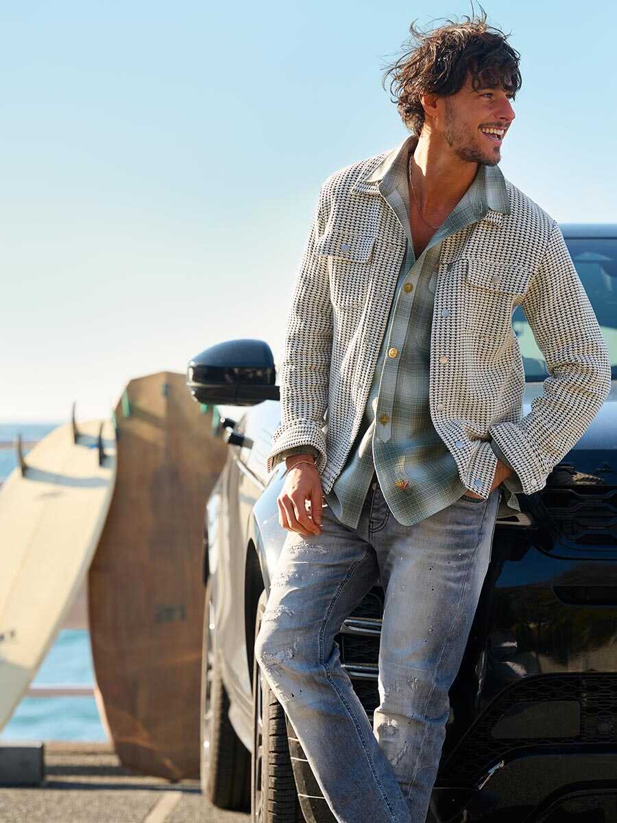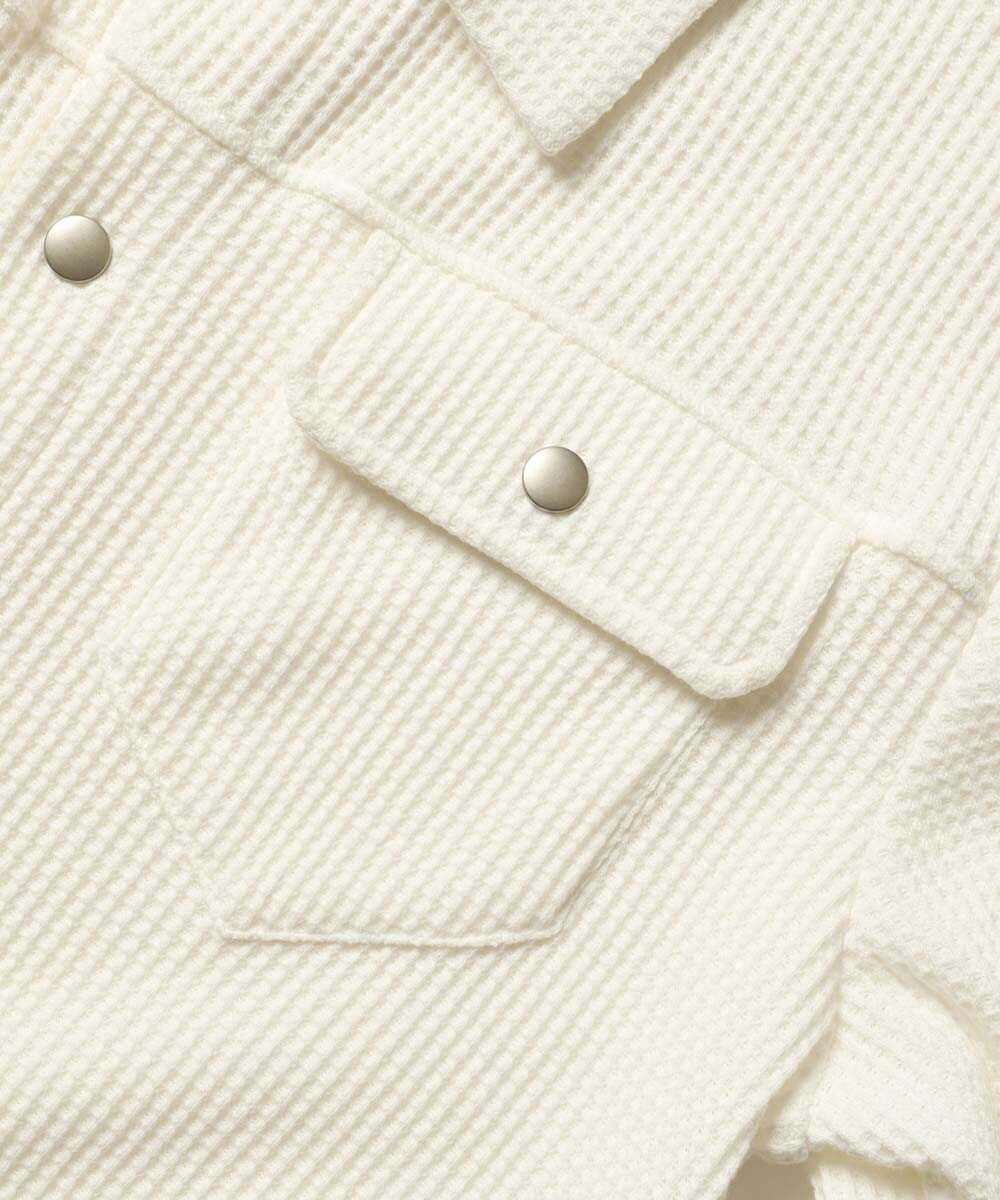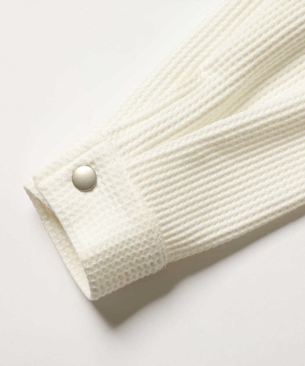 〈ダブルピー ウエストポイント〉が提案するのは、なんとふっくらとした肉厚なサーマル生地で仕立てたGジャン。デニムの硬さとは無縁の、包み込まれるような柔らかさがこのアイテム最大の魅力だ。サーマル特有の凹凸感が豊かな表情を生み、1着で存在感は抜群。保温性と通気性のバランスに優れているため、朝晩が冷え込む春の海沿いでも重宝する。リラックス感あふれる素材をGジャンの形に落とし込むことで、大人にふさわしい“抜け感”を演出してくれる。