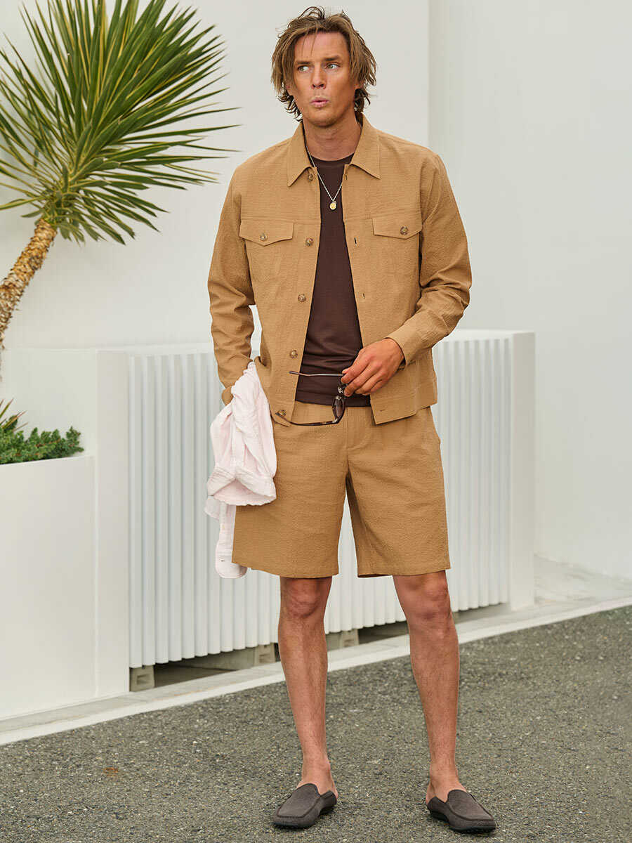 身に纏った瞬間に感じるのは、軽さと通気性のよさ。シアサッカー特有の立体感ある生地が、身体のラインをきれいに見せつつ、涼しげな雰囲気を醸し出してくれる。鏡に映る自分を見るたび、足取りも軽やかになるに違いない。セットアップになるショーツもあり、是非こちらも押さえておきたいところ。