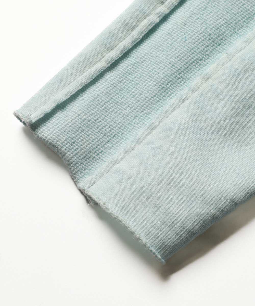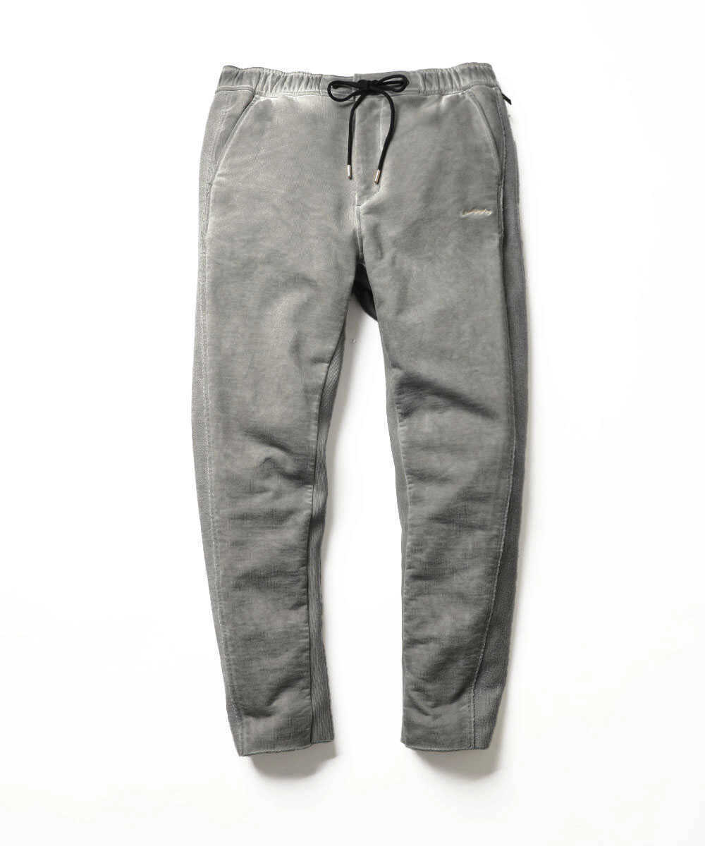 下半身を担うのは、パーカと同素材で仕立てられた美脚スウェットパンツ。同じくコールドダイによるフェード感のある生地をベースにしながら、こちらはより"動きやすさ"と"美しいシルエット"に特化した作りになっている。内股をリブ仕様にすることで抜群の可動域を確保しつつ、裾まわりはダボつかないようスッキリと計算されたテイパードラインを実現。パーカ同様、アウトラインに生地裏を効かせたデザインが縦のラインを強調し、脚長効果をさらに後押ししてくれる。休日の街着として、1枚でも大活躍間違いなしの完成度だ。