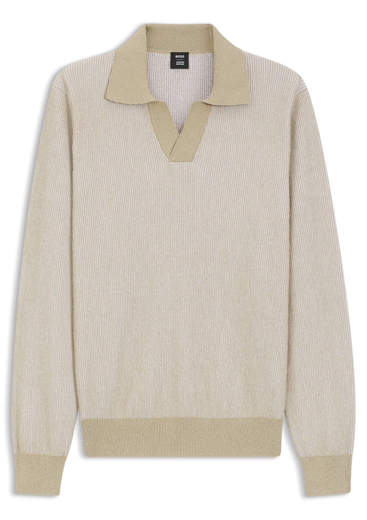 コントラストの効いたトリムとオープンカラーが特徴的なセーター。コットンを贅沢に使用した混紡糸を使用している。リラックスフィットのデザイン。 野球界のスター、大谷翔平選手が厳選したコレクションです。リブ、袖、裾のカラーが着こなすと自然とアクセントとなってくれる。5万2800円(ボス/ヒューゴ ボス ジャパン)