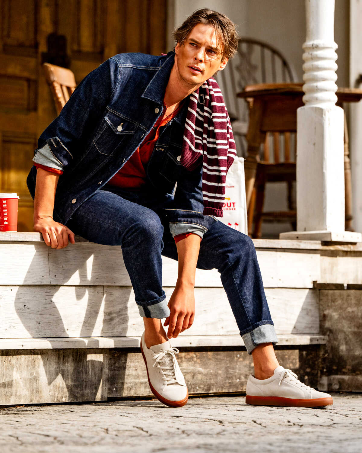 スニーカー3万1900円(エコー/エコー・ジャパン)、デニムジャケット7万5900円、デニムパンツ4万8400円(以上PTトリノ デニム/PT ジャパン)、ヘンリーネックニット3万8500円、肩にかけたニット3万8500円(以上スカリオーネ/トレメッツォ)、その他はスタイリスト私物