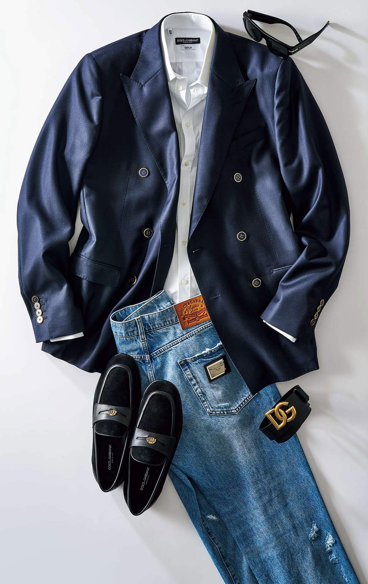 ジャケット58万3000円、シャツ9万3500円、デニムパンツ17万4900円、ベルト8万3600円、シューズ16万1700円(以上ドルチェ&ガッバーナ/ドルチェ&ガッバーナ ジャパン)、サングラス6万8640円(ドルチェ&ガッバーナ/ルックスオティカジャパン カスタマーサービス)