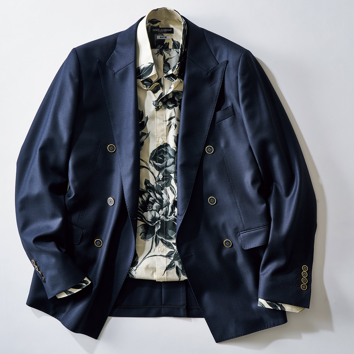 フラワープリントのシャツで、華のあるジャケデニ姿 に。そんな思い切ったコーデが簡単にまとまってくれるのも、紺ジャケ&薄青デニムコーデならでは。コンサバ見えしがちなジャケデニで冒険したいと思っていた人には光明かも!? ジャケット58万3000円、シャツ24万3100円(以上ドルチェ&ガッバーナ/ドルチェ&ガッバーナ ジャパン)