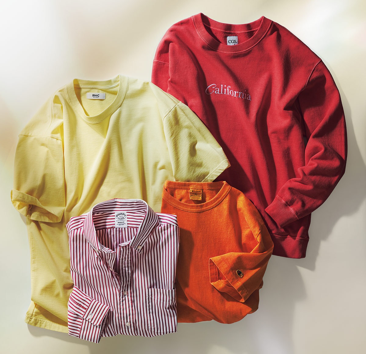 右上:〈カリフォルニアジェネラルストア〉の赤スウェット レタリングをあしらった赤いスウェットシャツ。特殊な加工でヴィンテージのような褪せ感があり、ビーチ映えする。2万1450円(カリフォルニア ジェネラルストア) 右下:〈チャンピオン〉のオレンジT 肉厚な生地を使い、サイドに縫製のない丸胴仕様に仕上げているから着心地は最高。1万780円(チャンピオン/ヘインズブランズ ジャパン カスタマーセンター) 左上:〈RHC〉のイエローT 絶妙なヨレ感ときれいな色合いが光るイエローT。インに仕込むだけで、カリフォルニアのリラックスした空気感が伝わる!? 2万900円(RHC / RHC ロンハーマン) 左下:〈ブルックス ブラザーズ〉の赤ストライプ カジュアルにもドレスにも合わせやすい、正統派の赤ストライプのBDシャツ。3万5200円(ブルックス ブラザーズ/ブルックス ブラザーズ ジャパン)