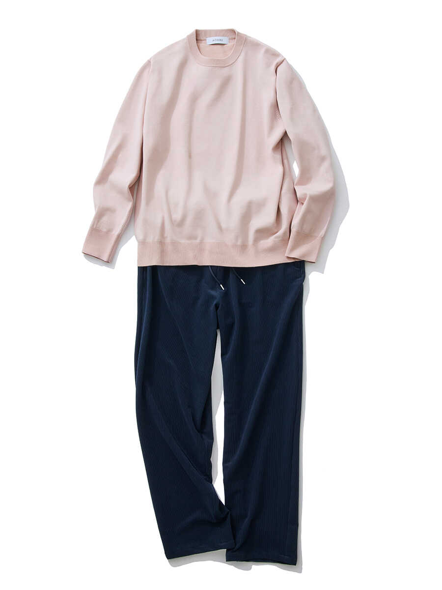 お家でまったりと過ごすリラックスデートなら、頑張りすぎないシンプルさが鍵になる。とはいえ、ただの部屋着に見えてしまってはムードも台無し。そこで選びたいのが、美しい生地感。たとえば、こんなきめ細やかな生地感が上質な無地ニットだ。春らしい淡いピンクが、大人の包容力とほんのりとした色気を演出してくれる。合わせるボトムも、ソファでくつろぐのにぴったりな太めでリラックス感のある1本をチョイス。これなら快適に過ごせるうえに、そのあと近所のカフェへのちょっとした外出なんてことにも堂々と対応できるはず。