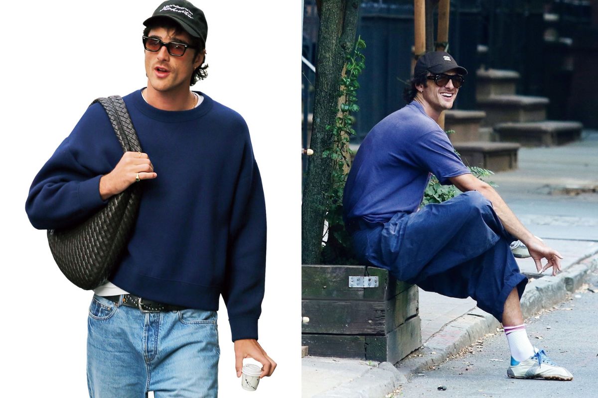 青コーデが好きすぎるブラッドリー。人気ドラマに登場するゲームショーのプリTに加え、シャツジャケにインしたニットも真っ青!