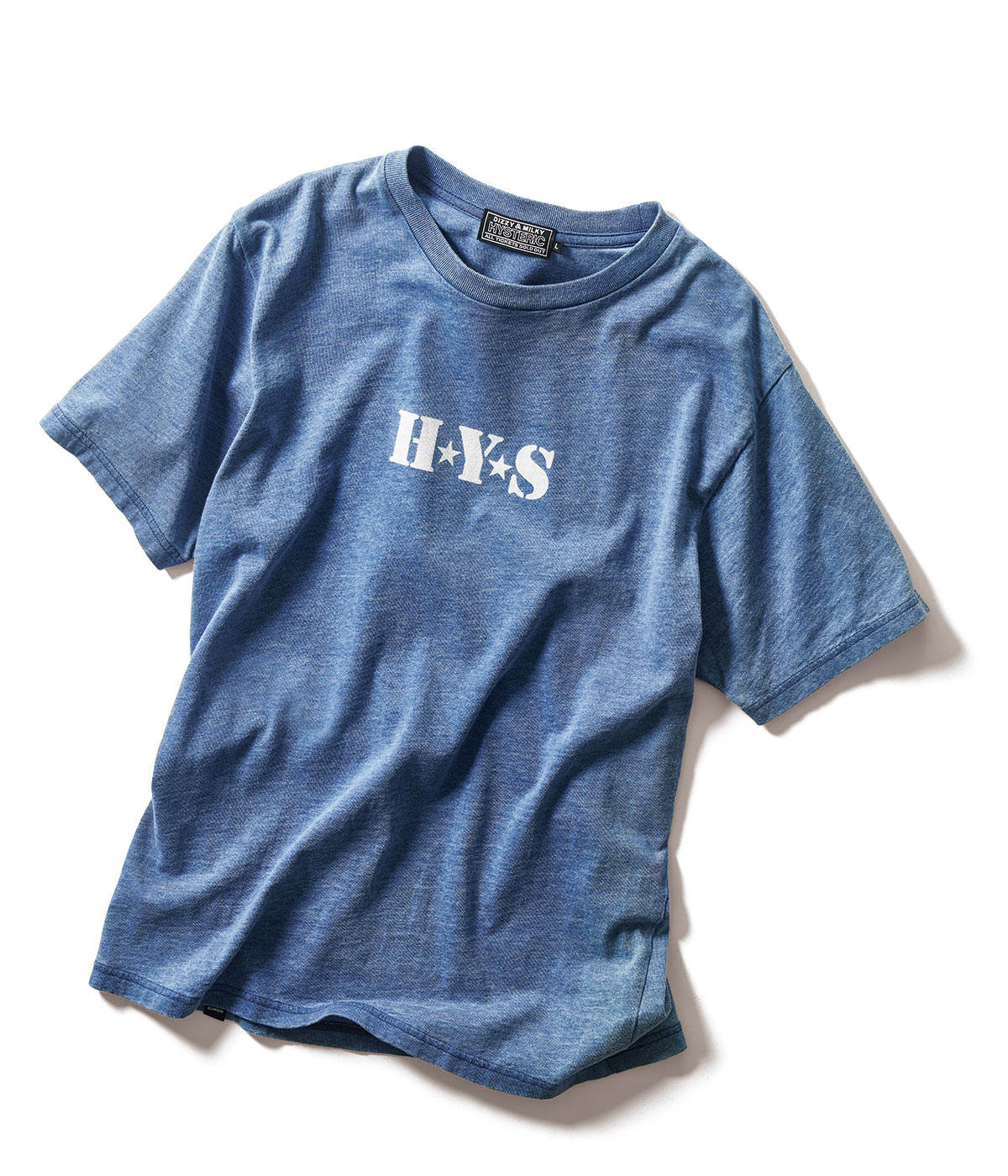 先染めインディゴ糸で仕立てた1枚。洗い加工で中の白糸を見せた作りが特徴的で、ジーンズのような経年変化を楽しめる。プリントは、ミリタリーな書体でタフさを感じる作りに。1万4300円(ヒステリックグラマー)