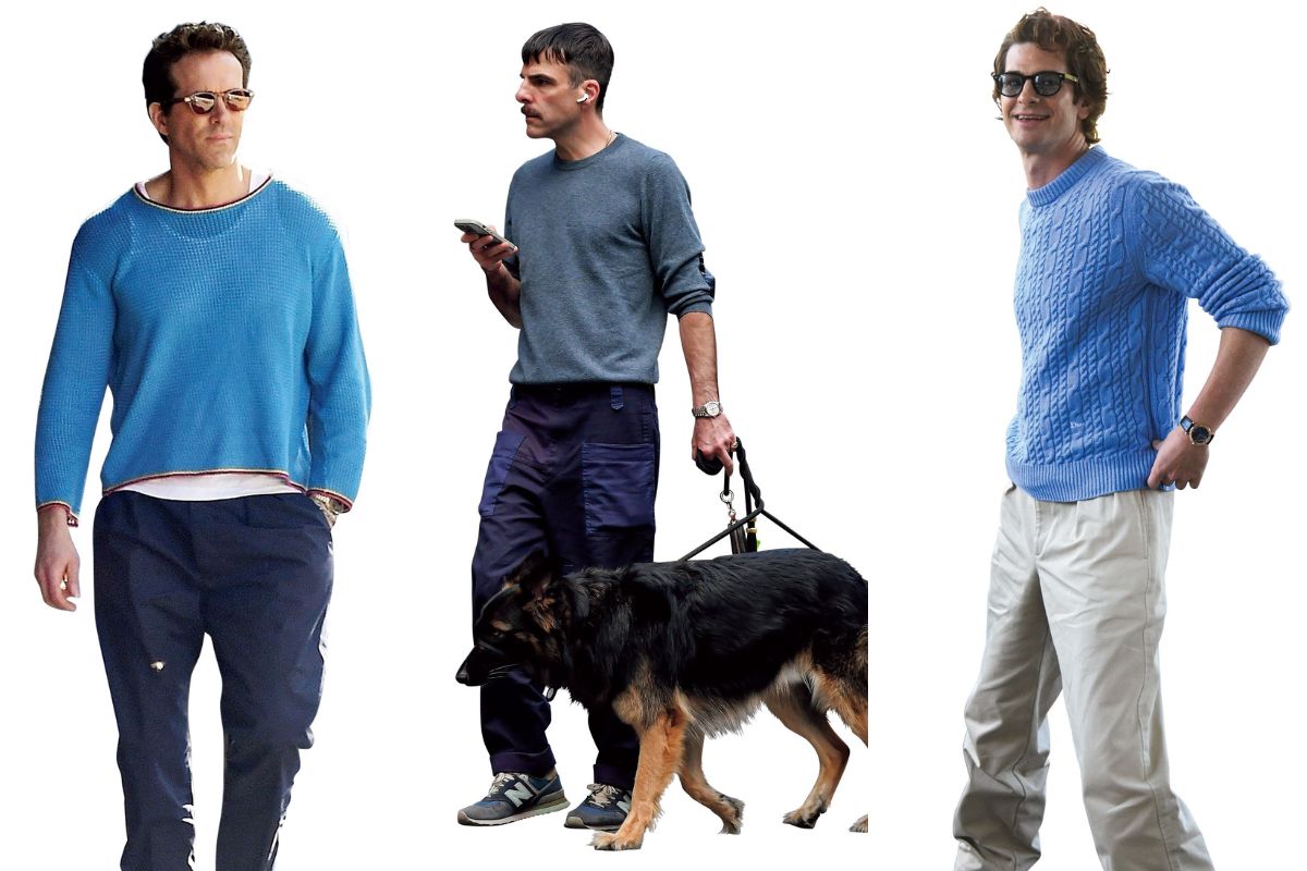 右:アンドリュー・ガーフィールドは品よく爽快な空色のケーブルニット姿で映画祭へ 中:味青ニットをカットソー感覚で着こなし、ザッカリー・クインとは肩の力が抜けた大人カジュアルに 左:ライアン・レイノルズは白タンクが透ける薄ニットで、軽快なレイヤードに