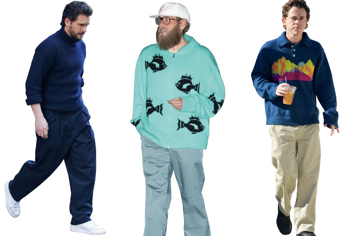 右:派手色が映えるニットポロ姿でジョン・オーウェン・ロウはランチへ 中:ジョナ・ヒルの波乗り愛を感じる熱帯魚プリントのニット姿 左:英国人俳優のキット・ハリントンはタートルネックで、濃青の上品さを味方につけた装い
