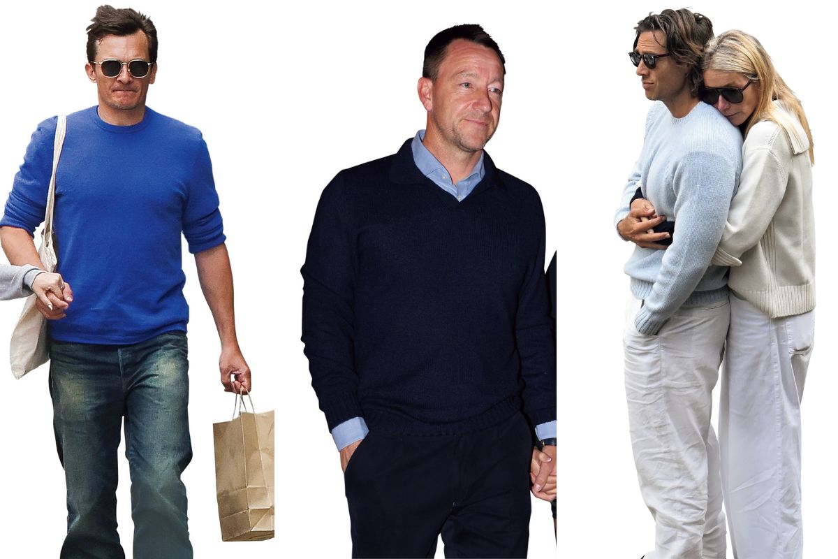 右:淡青ニット姿でグウィネス・パルトローと佇むブラッド・ファルチャックの姿は、映画のワンシーンのよう! 中:ドレスシャツを合わせたジョン・テリーの品格あるニット姿 左:ルパート・フレンドは味デニムも青ニットの効果で好印象!