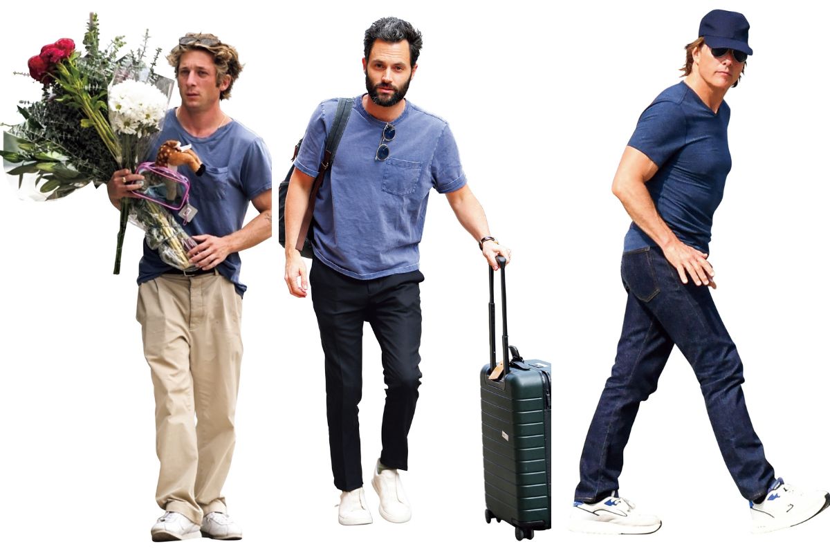 右:仕上がったカラダが映えるトム・クルーズの青ピタT姿! 中:ペン・バッジリーは黒パンツ姿をくすんだ味青Tで軽やかに 左:真面目っぽくなりがちなチノパン姿も、味青ポケTのおかげで力が抜けたお洒落のジェレミー・アレン・ホワイト