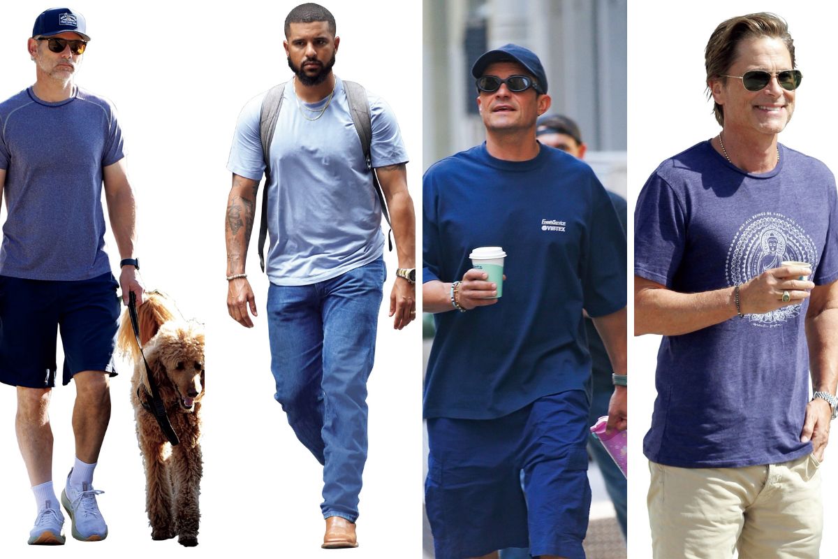 右:ロブ・ロウはオリエンタルなプリントTシャツが印象的 右中:日本のブランドにも精通したオーリーらしく、〈フレッシュサービス〉の濃青Tを愛用 左中:ミルウォーキー・ブリュワーズの頼れる右腕グラント・アンダーソンは、淡青Tと青デニムで清涼感をアピール 左:クリス・パインのスポーティな青T姿は、愛犬と思い切り遊ぶための選択!?