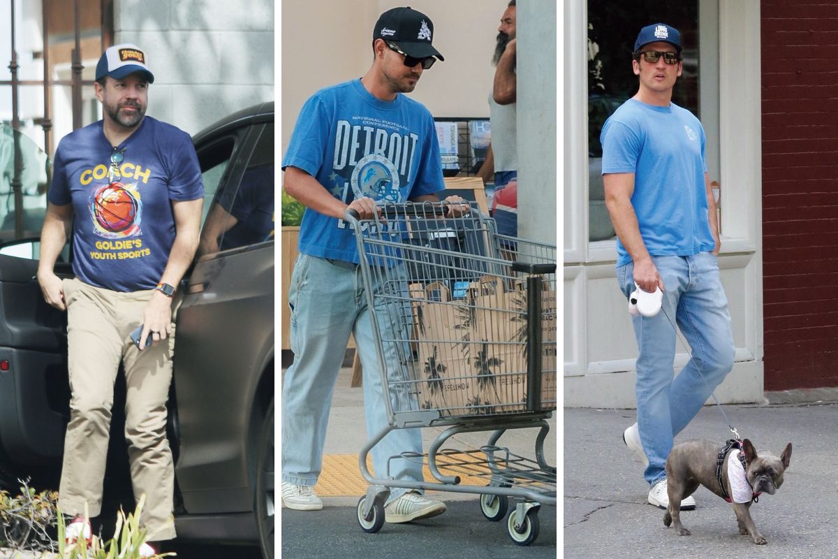 右:マイルズ・テラーは全身青のデニム姿で気分も爽快に! 中:テイラー・ロートナーの〈エレウォン〉でのお買い物姿の主役は、デトロイト・ライオンズのプリントT ! 左:ジェイソン・サダイキスはバスケモチーフのプリントTもトラッカーキャップも青で統一!