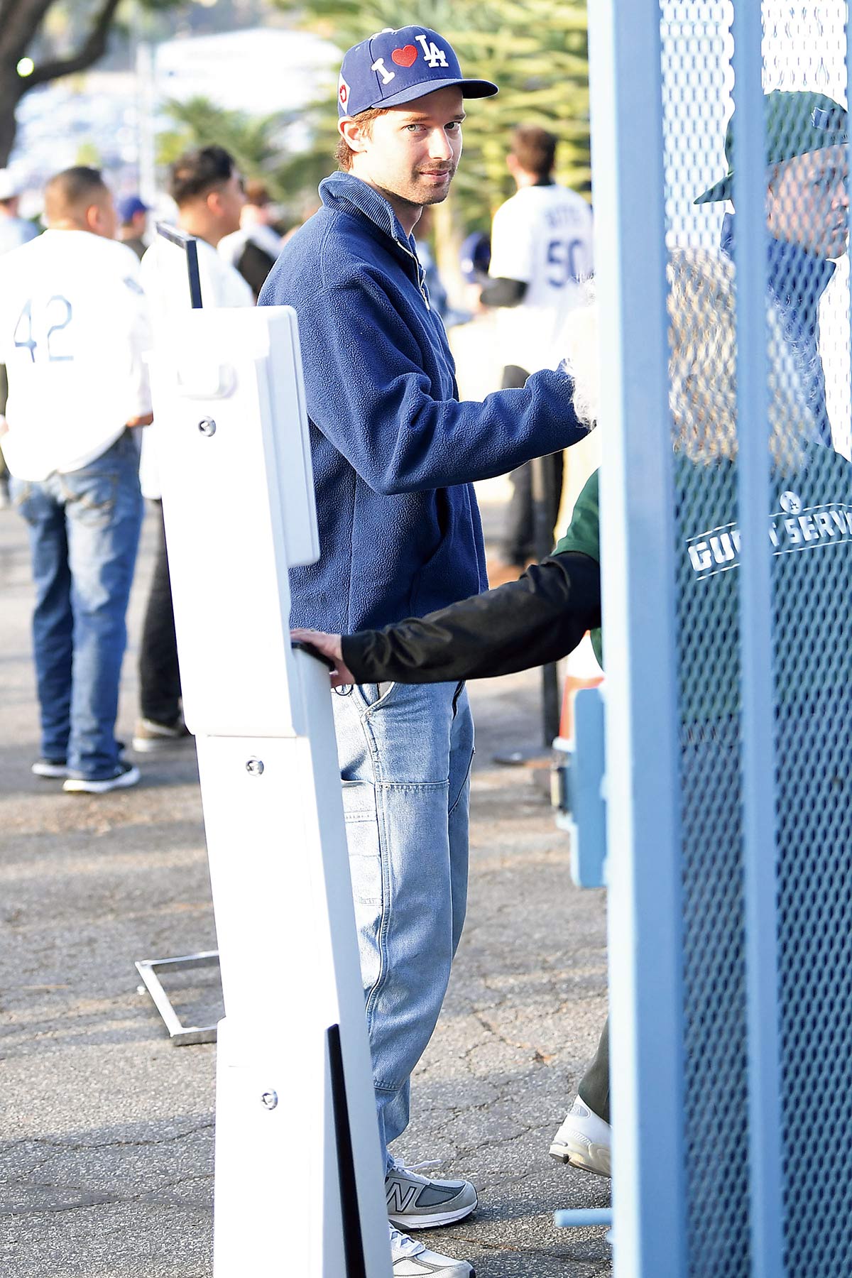 試合観戦はドジャース愛を前面に押し出したキャップに、ブルーをまとった装いで。この日はロブ・ロウ親子と一緒に球場へ