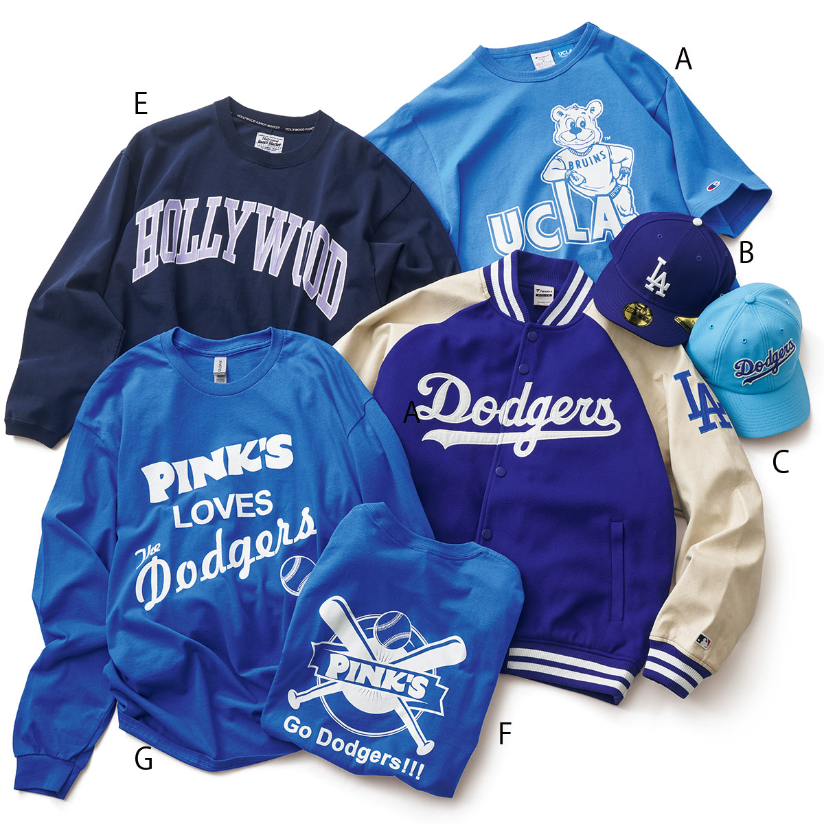 A:ヘビーウエイトTの代名詞〝T 1011〞に、UCLAのマスコットをオン。9790円(チャンピオン/ヘインズブランズ ジャパン カスタマーセンター) B:選手が被るのと同じデザインの〝59フィフティ〞。 6600円(ニューエラ) C:〝ドジャースロゴ〞も清々しい配色に。4400円(フォーティーセブン) D: 裏地までもあざやかな〝ドジャーブルー〞で彩られた、メルトン製スタジャン。2万4200円(ファナティ クス/ファナティクス・ジャパン) E :〝HOLLYWOOD〞をカレッジT風書体で新鮮に。2万2000 円(ハリウッド ランチ マーケット) F:LAの老舗ホットドッグ店〈ピンクス〉のオリジナルT。オー ナーが熱狂的ドジャースファンということで、2017年のワールドシリーズ出場を記念して作ったの だとか。4990円(ピンクス/ジャラーナ本店) G:同じプリントのロンTも。6990円(ピンクス/ジャ ラーナ本店)