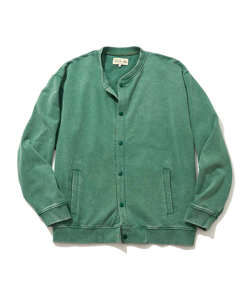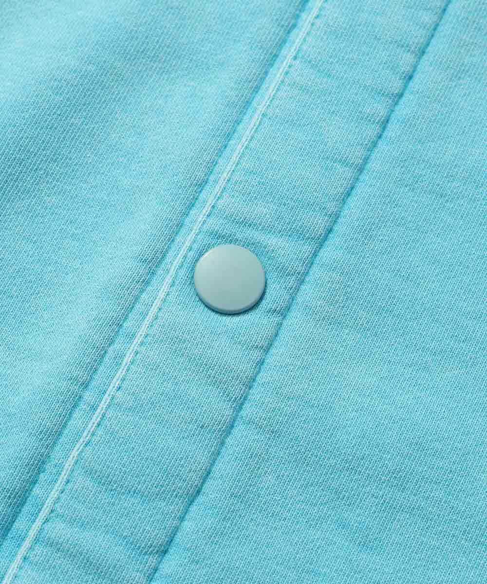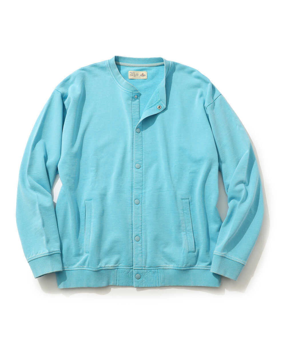 顔料染めを施した糸を使い、まるで長年連れ添ったヴィンテージアイテムのような風合いを表現したスナップ仕様のスウェットカーデ。派手な装飾を削ぎ落としたミニマルなルックスだからこそ生地の豊かな表情が際立ち、いつものTシャツの上に羽織るだけで、大人の週末スタイルにこなれた印象を与えてくれる。300gという、重すぎず軽すぎない中肉の裏毛素材は、少し汗ばむような春の陽気でもサラリと快適な状態をキープ。街中でのショッピングからリラックスタイムまで、普段使いとして申し分のない心地よさを提供してくれる。その柔らかな肌触りは、海上がりの素肌に直接纏うといったアクティブな提案にも応えてくれるほど優秀だ。季節の変わり目のライトアウターとしても重宝するはず。ターコイズカラーは『Safari Lounge』だけの別注カラーなのでお見逃しなく!