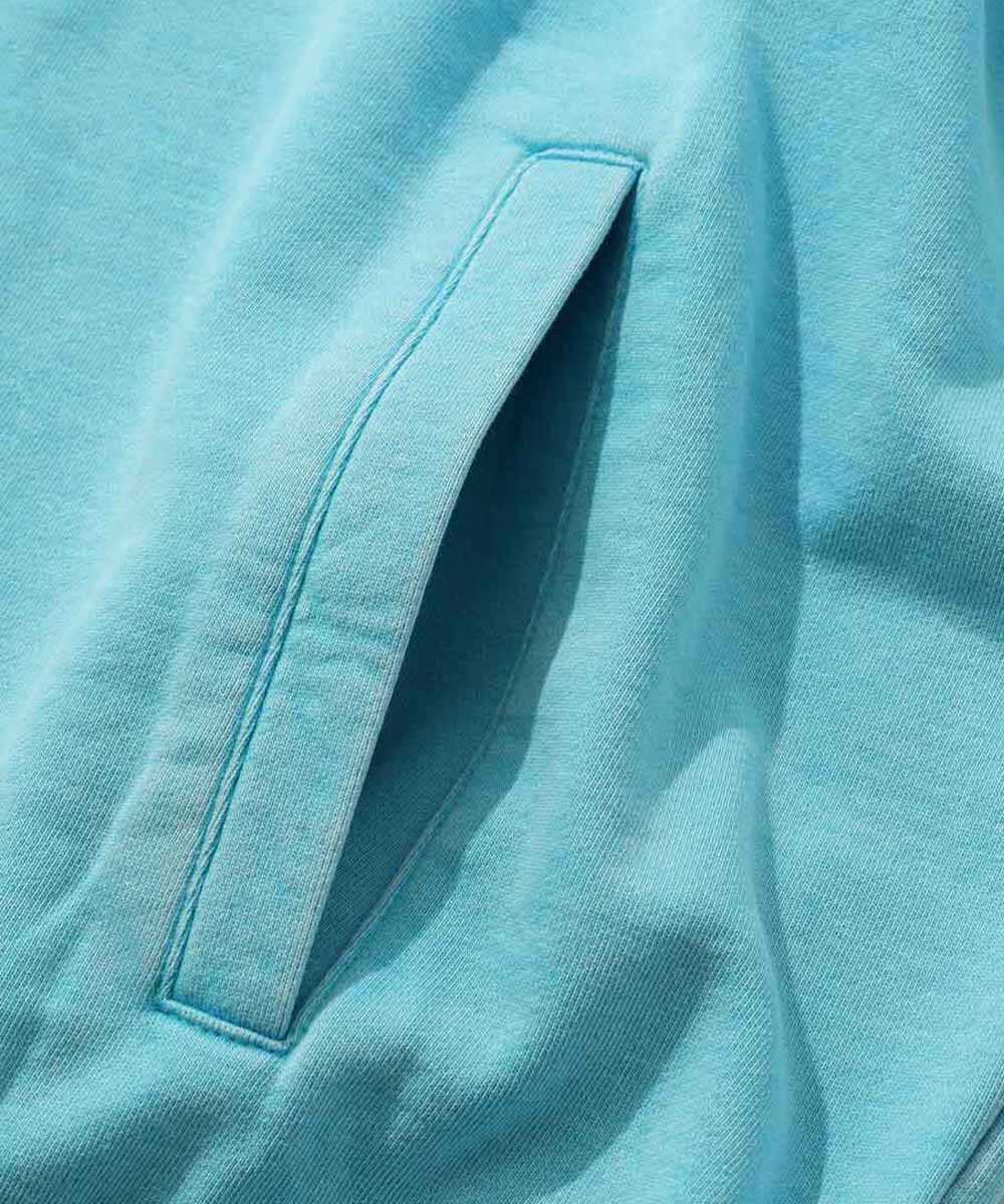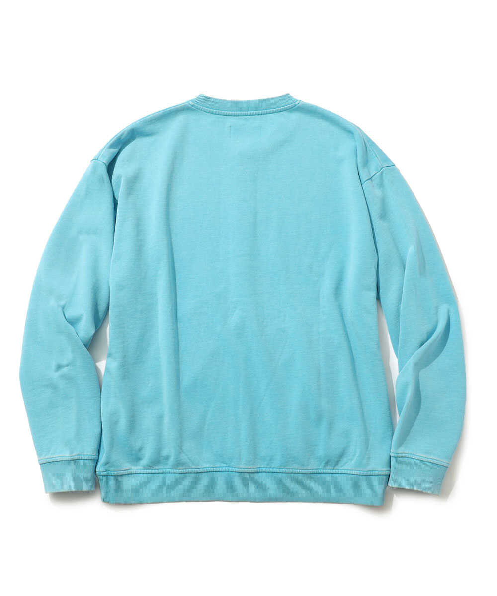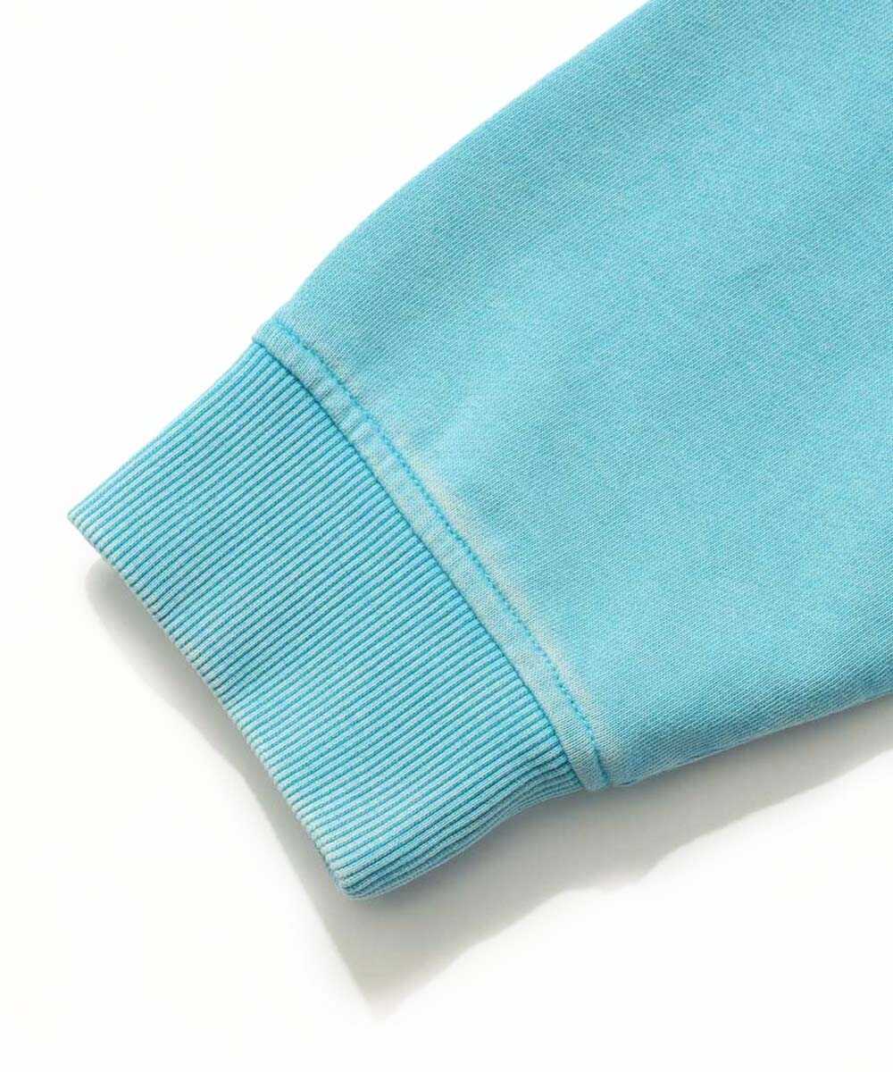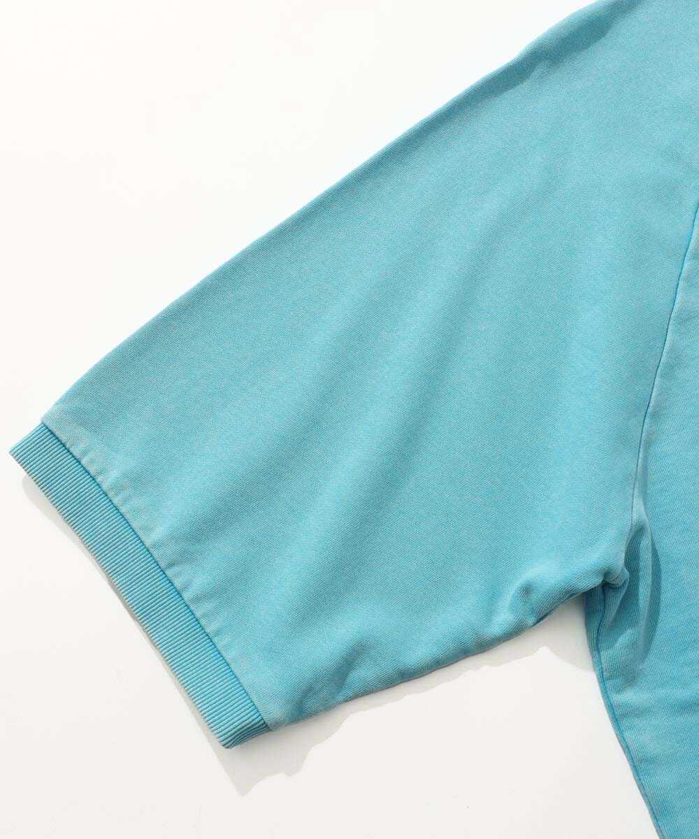 顔料染めした糸を使用し、さらにパウダーブリーチウォッシュという後加工をプラスすることで、より深みのある表情を引き出した半袖のスウェットTシャツ。徹底したこだわりが、まるで古着のようなくたっとしたこなれ感を生み出している。ゆったりと確保された身幅が、大人の休日にふさわしいリラックスした着心地をお約束。締め付け感のないシルエットでありながらも、決してだらしなく見えない絶妙なバランス感覚が見事だ。こちらも先程の1着と同じ生地を採用しており、1枚で着ても頼りなさは皆無。着込むほどに色落ちやアタリを楽しめるため、自分だけのヴィンテージへと育てる喜びも味わえる、まさに大人のための日常着と言える。こちらもターコイズカラーは『Safari Lounge』の別注カラー。