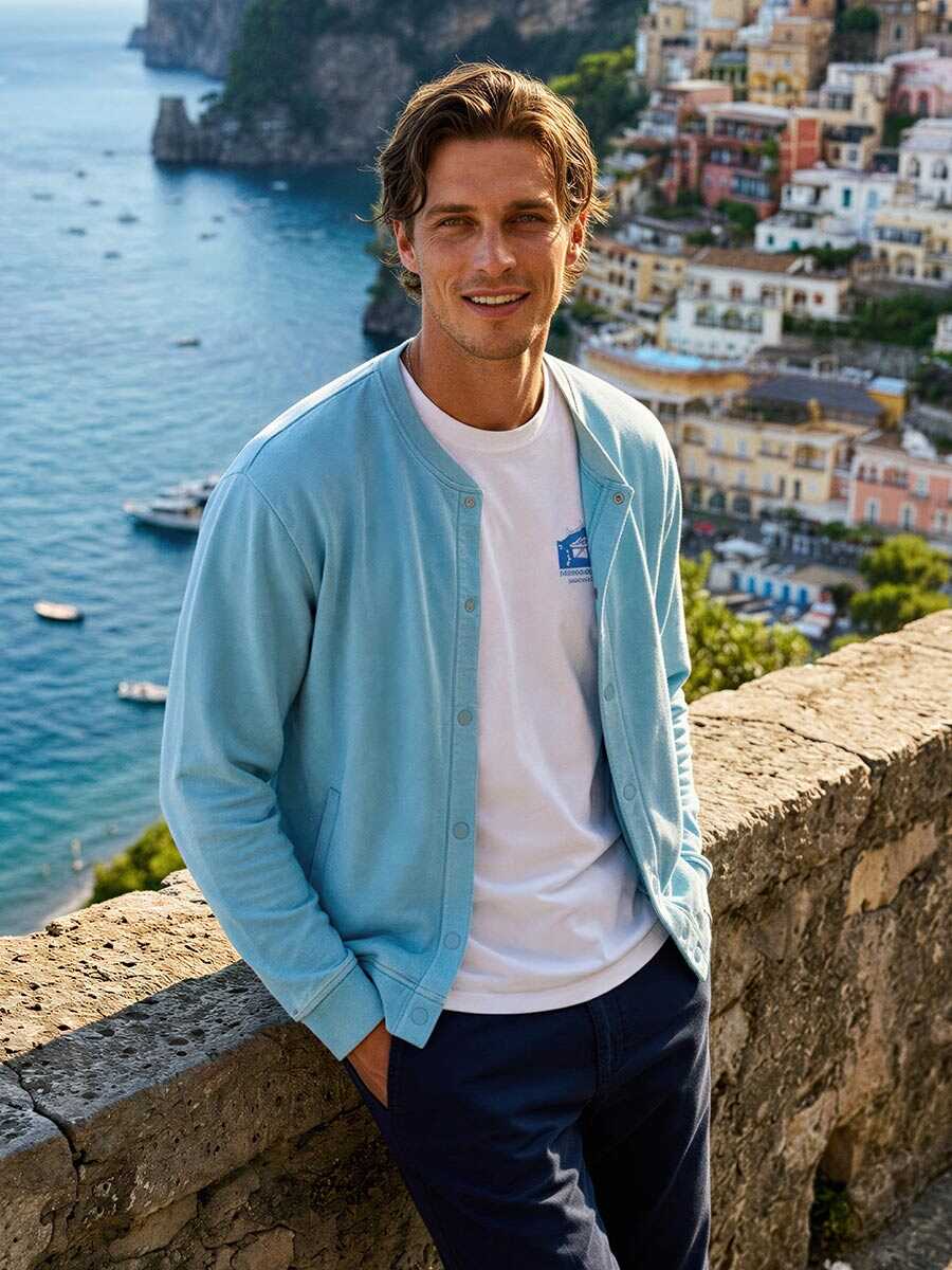 ターコイズブルーの1着をラフに羽織った姿は、爽やかな春の風を感じさせる。インナーの白Tシャツとのコントラストが美しく、肩の力が抜けたリラクシーな雰囲気が漂う。休日の朝、思わず袖を通したくなるような軽快さがあり、これを纏ってふらりと街へ出かければ、心身ともにリフレッシュできる確かな高揚感に包まれるだろう。
