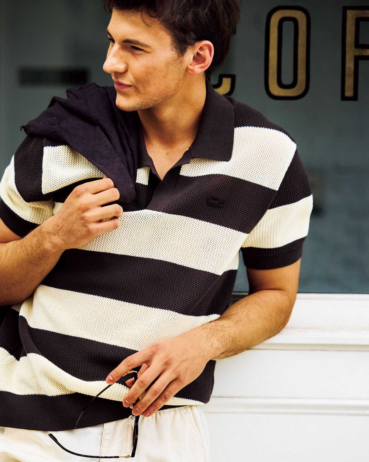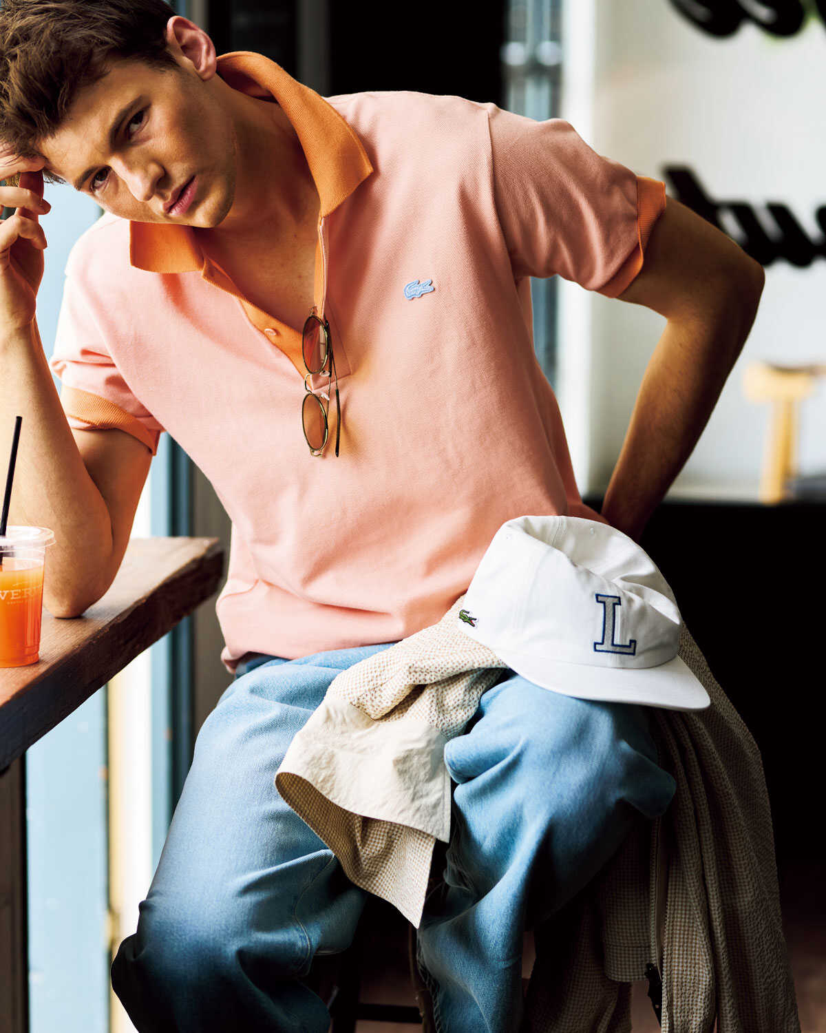 ポロシャツ〈5月発売予定〉1万7600円、デニムパンツ2万2000円、キャップ7700円、膝にかけたブルゾン3万9600円、胸にかけたサングラス3万1900円(以上ラコステ/ラコステお客様センター)