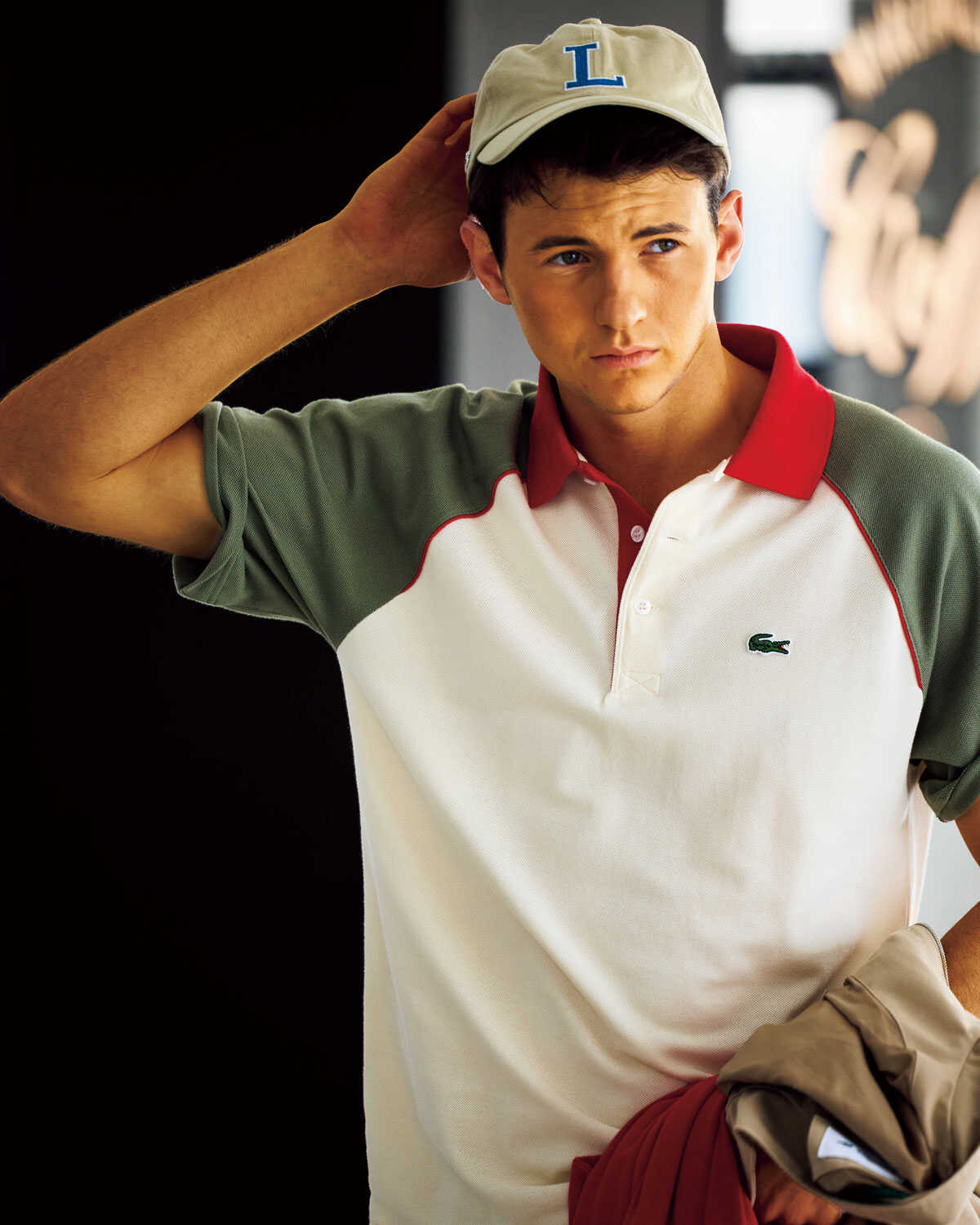 ポロシャツ〈原宿店限定〉1万9800円、キャップ7700円、手に持ったポロシャツ1万7600円、手に持ったブルゾン3万6300円(以上ラコステ/ラコステお客様センター)