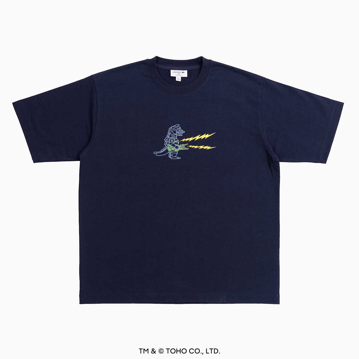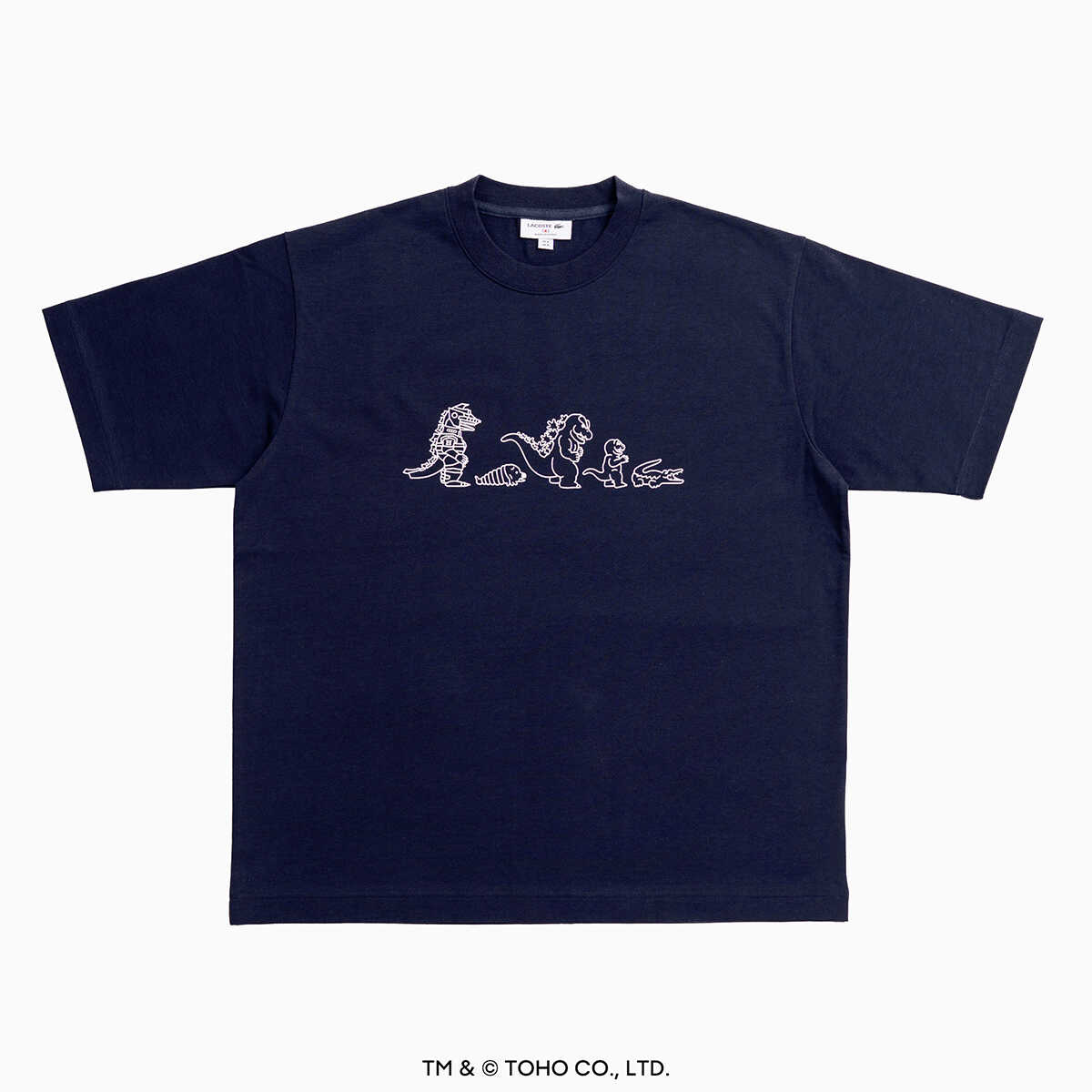 ラコステ 新宿店 限定アイテム。4/25(土)より発売予定。ネイビーのメカゴジラTシャツ1万6500円(ラコステ/ラコステお客様センター)