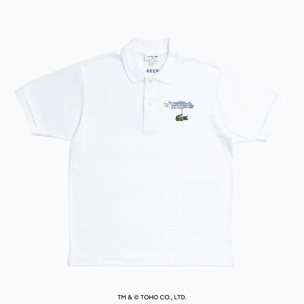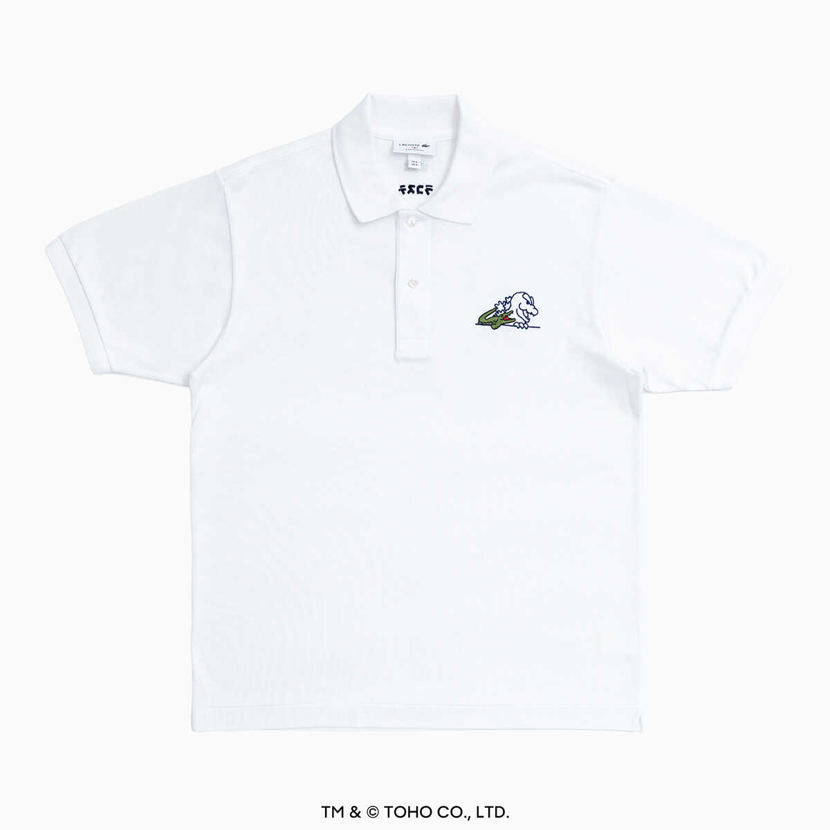 5/29(金)より発売予定。ホワイトのメカゴジラ ポロシャツ2万2000円(ラコステ/ラコステお客様センター)