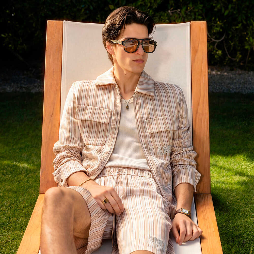 象徴的なのが、全ルックに合わせられたアビエータータイプの“サンセット・サングラス”。ゴールドのアクセントが効いたこの一本が、スタイル全体に余韻のような華やぎをもたらしている。
