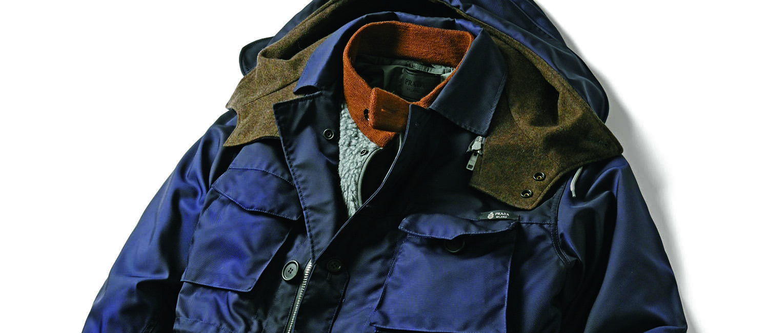 ボディのイタリア製ハイストレッチタフタ素材は、光沢感もあって上品な雰囲気。フードは着脱式で、立ち襟として着ることも。3万8000円(ブラックレーベル・クレストブリッジ/SANYO SHOKAI カスタマーサポート)