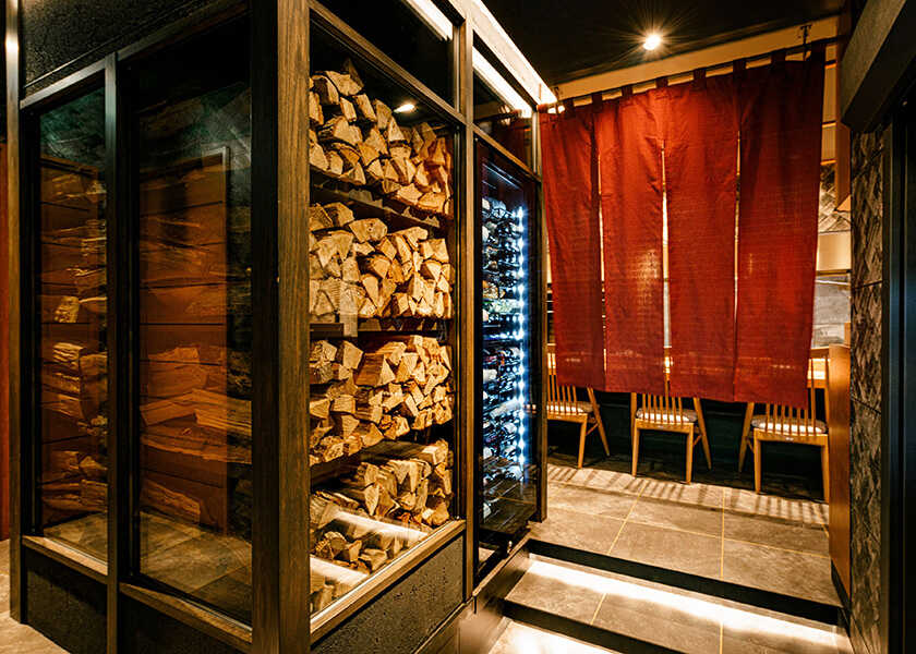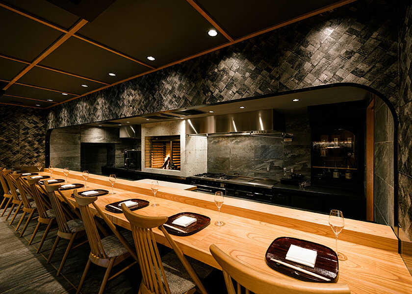 店内には大きな薪窯が据えられていて、薪や炭で創り上げられた料理を五感で堪能できるのが特徴。8席カウンターは、まるで舞台の客席のように臨場感があり、ゆらぐ炎を見ながらリラックスして食事できる。料理長の田村勝宏さん