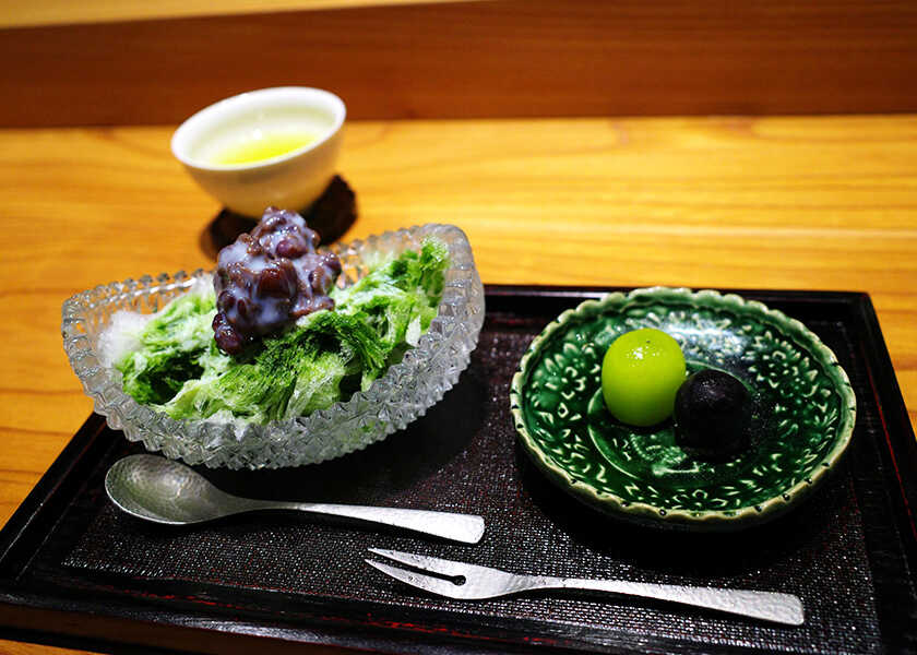 甘味は水菓子とかき氷。前者はシャインマスカット、ナガノパープルで、後者は氷菓子ながらも年中提供されるシグネチャーデザート。マンゴーとマスカルポーネ、宇治金時、カボスヨーグルトの中からフレーバーがチョイスできて、定番は宇治金時。上品な風味と渋味をまとっていて、米粉のクランブルが小気味いい。