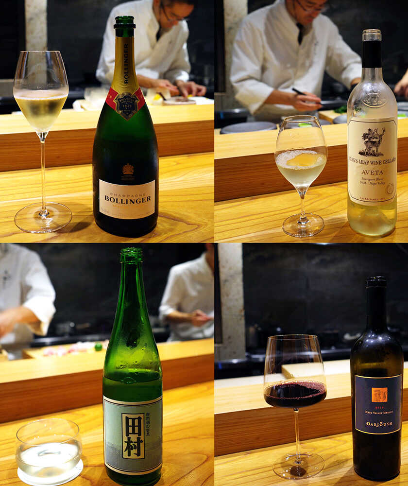 田村さんの料理にぴったりなお酒もある。困ったら、マネジャーの佐藤篤さんに相談してみて。左上:“ボランジェ スペシャル・キュベ” 左下:“田村 生もと純米” 右上:“スタッグス・リープ・ワイン・セラーズ アヴィータ ソーヴィニヨン・ブラン 2023” 右下:“ダリオッシュ ナパ・ヴァレー メルロー 2018”