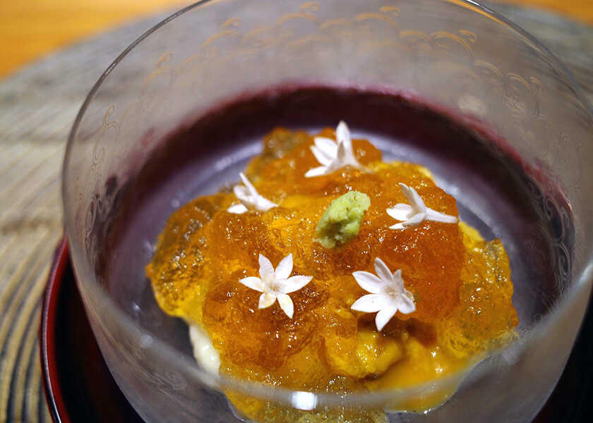 先附として供される“雲丹と湯葉馬鈴薯”は、グラス仕立ての軽快な一品。湯葉とジャガイモのペーストは、適度な弾力と甘味が食欲をそそる。その上には力強い雲丹と旨味のある琥珀ジュレがあり、ワサビが刺激的で、白いペンタスの花が愛らしい。“蒸し鮑と江戸菜”