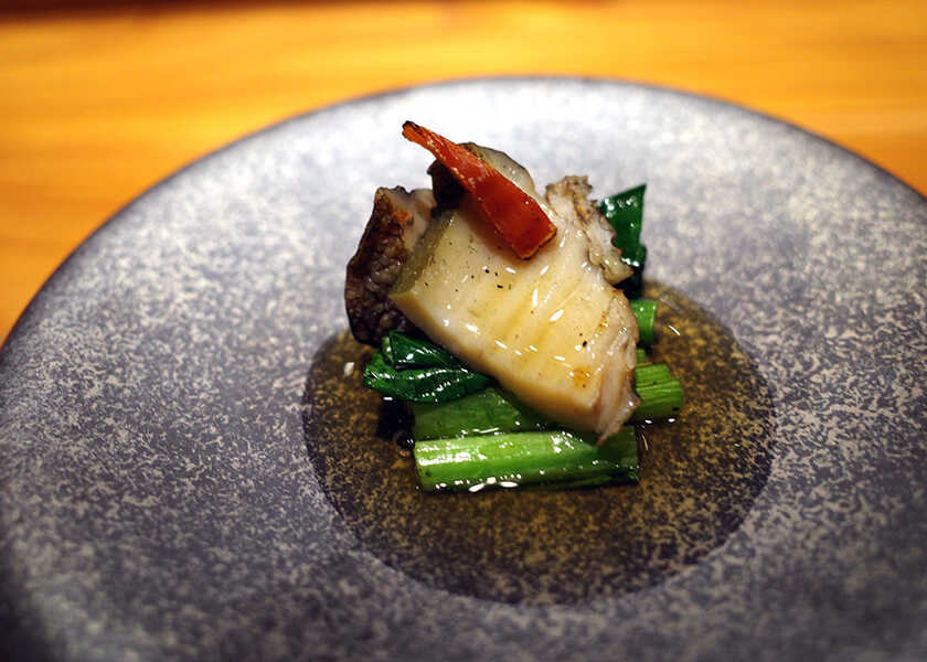 贅沢なもうひとつの先附が、“蒸し鮑と江戸菜”。繊細な食味の江戸菜を薪で焼き、滋味のあふれる黒鮑は蒸した後に炙った。あしらわれたバチコ=“ナマコの卵巣の塩漬け”は旨味に富んでいて、酒肴にもぴったり。ポン酢餡が爽やかで、全体のバランス感がとれている。“鮪 薪の香り”