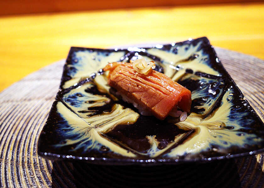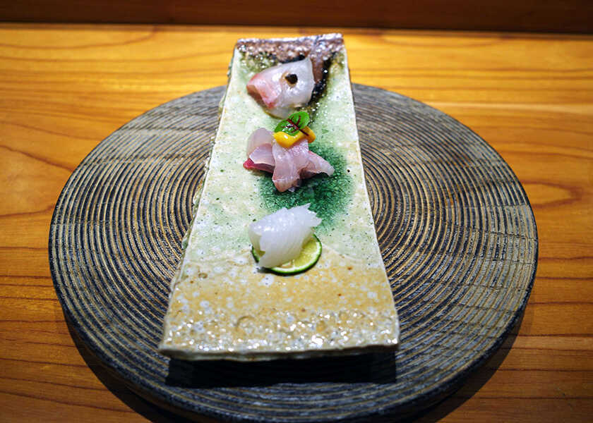 お凌ぎには、田村さんが自ら握る“鮪 薪の香り”。脂が適度に乗った中トロの漬けを炙って、マイルドな白シャリと合わせた。燻香豊かないぶりがっこがの塩味とシャキシャキ感が印象的。朝鮮唐津の“侘び寂び”の色合いが握りを引き立てる。“お造り”