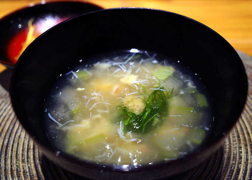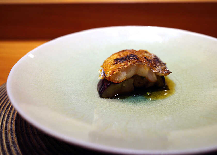 御椀は“毛蟹と冬瓜”で、毛蟹の出汁と葛の上品な汁物に仕上げられている。たっぷりの滋味あふれる毛蟹に、とろっとした冬瓜の組み合わせが出色。“太刀魚と茄子”