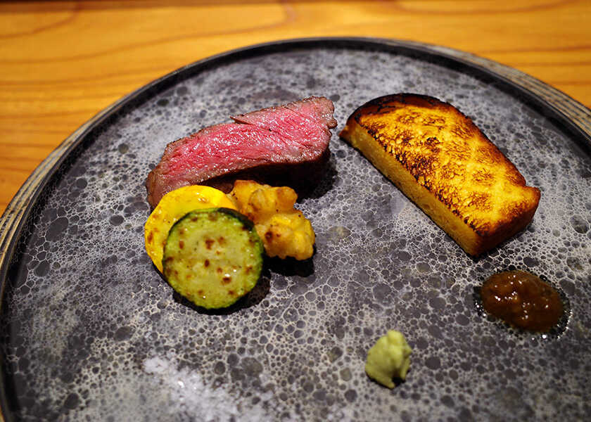 メインディッシュは“黒毛和牛サーロイン 自家製ブリオッシュ添え”。妙妙たる味わいの熊本県の黒毛和牛のサーロインに、黄と緑のズッキーニ、炙ったブリオッシュ、揚げたトウモロコシを添えた。コンディメントには金山寺味噌バター、ワサビ、塩が添えられるので、どれが好みか試してみて。“食事”