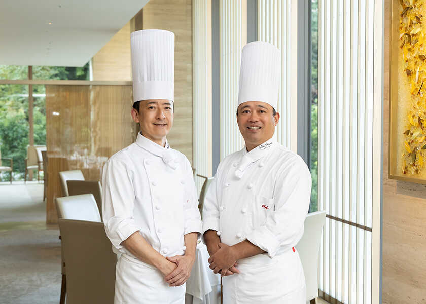 山下さんはミシュランガイド1つ星の南フランス〈ラ・メゾン・ジョンヌ〉で修業し、魚介類の技術を磨いた。2021年の〈ホテルオークラ京都 岡崎別邸〉開業時には総料理長を務め、和食文化が根づく京都で出汁を取り入れるなど、日本の食材の繊細な味を最大限に引き出すスタイルを確立。その技術と経験を活かすべく、満を持して〈ヌーヴェル・エポック〉で腕をふるう!左:料理長の山下亮一さん 右:シェフパティシエの荒木貴志さん
