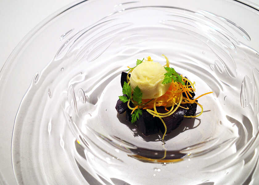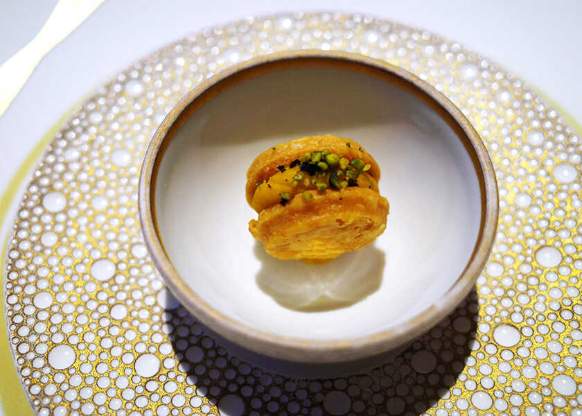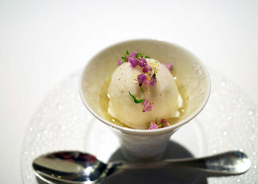“季節の野菜たちの小さな一皿”では、ニンジンのデクリネゾン=変化を楽しめる。紫ニンジン、黄色ニンジン、白ニンジン=パースニップの3種類を使用。紫ニンジンは白ワインビネガー、黄色ニンジンはムースにしてオレンジジュースと合わせ、パースニップにアイスクリームに。セルフィーユやニンジンのジュリアンヌも添えられ、滋味にあふれる一皿に仕上げられている。“甘鯛の松笠焼きとモン・サン・ミッシェル産ムール貝 里芋ピューレに甘鯛とムール貝のブイヨンに昆布オイル”