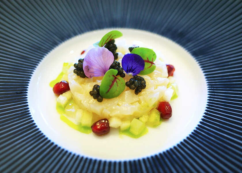 帆立貝柱のタルタルとオシェトラキャビア ザクロと林檎とセロリにハーブオイル