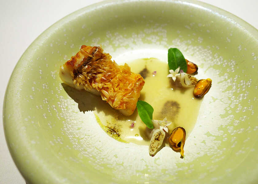 甘鯛の松笠焼きとモン・サン・ミッシェル産ムール貝 里芋ピューレに甘鯛とムール貝のブイヨンに昆布オイル