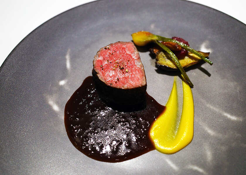 魚料理は“甘鯛の松笠焼きとモン・サン・ミッシェル産ムール貝 里芋ピューレに甘鯛とムール貝のブイヨンに昆布オイル”。甘鯛は鱗を美しくカリカリっと仕上げており、白眉のテクスチャー。味の詰まったモンサンミッシェルのムール貝は“追い滋味”となり、甘い百合根、鮮やかなエディブルフラワーが脇を固める。ムール貝のソースに加えて、白味噌と里芋のピューレがよく合う。“備長炭で炙ったあか牛サーロインに季節の野菜 酸味を利かせた赤ワインソース”