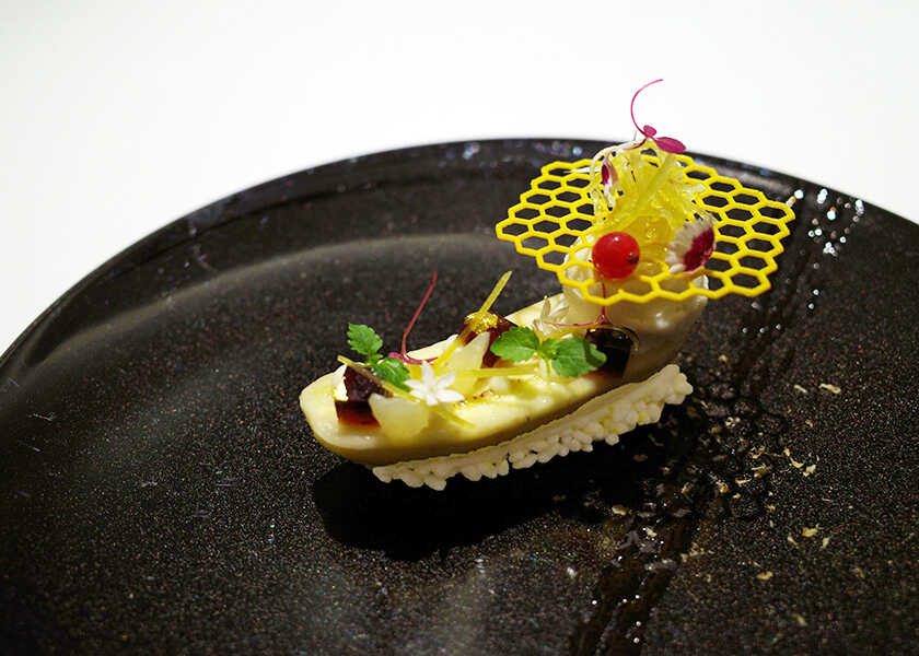 “沖縄県産島バナナと国産レモンのコンポート アーモンドとトンカ豆の香りとともに”は、珍しい“島バナナ”を主役に据えた。沖縄の島バナナと国産レモンのコンポートは甘味と酸味のメリハリがあり、その下にはサクッとしたホワイトチョコレートでコーティングしたライスパフ。ハニーコームを模したチュイールには可愛げがある。