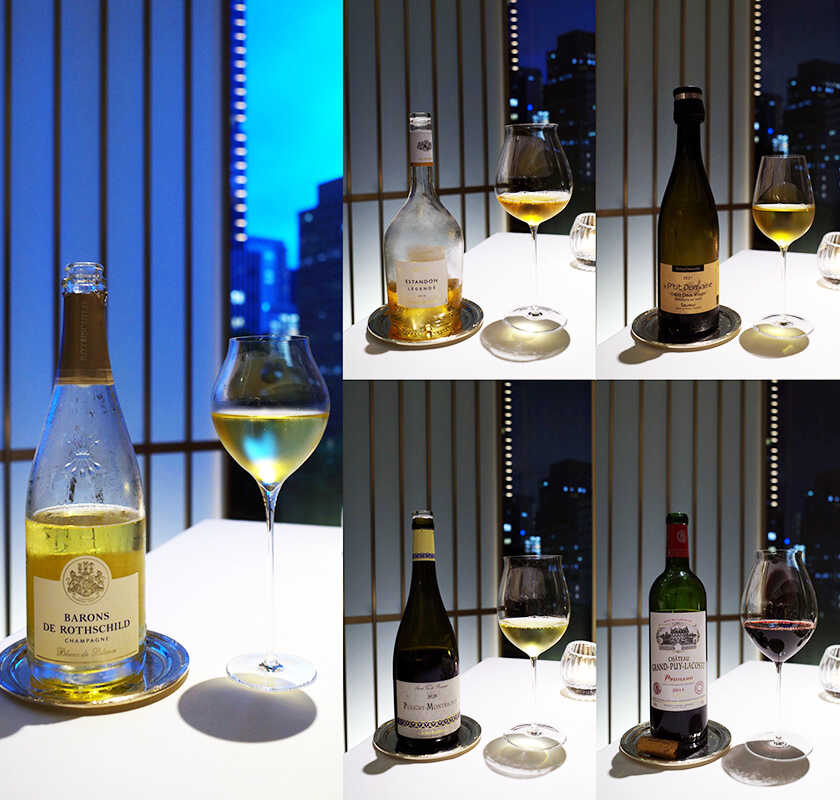 山下さんのフランス料理に合わせて、ワインペアリング(2万7000円/5グラス)も注文するのが正解。左:“シャンパーニュ・バロン・ド・ロスチャイルド ブラン・ド・ブラン” 中上:“エスタンドン レジャンド ロゼ 2018” 中下:“ドメーヌ・ジャン・シャルトロン ピュリニー・モンラッシェ 2020” 右上:“ル・プティ・ドメーヌ アントル・ドゥ・ヴォア ソーミュール・ブラン 2021” 右下:“シャトー・グラン・ピュイ・ラコスト 2011”