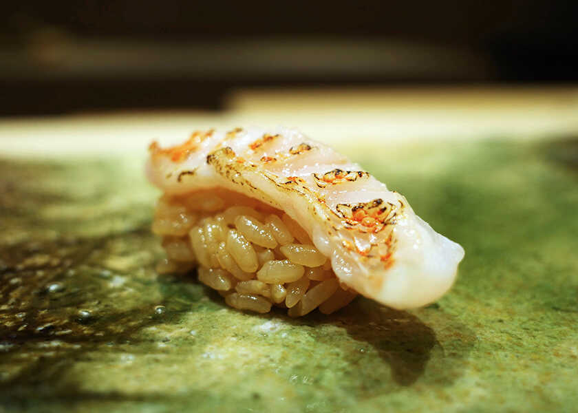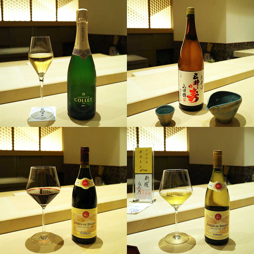 “コレ ブリュット”(3668円)は、アペリティフに最適なシャンパーニュ。細やかな泡で、柑橘系の香りが爽やか。バランスのとれたテクスチャーで先付から前菜にもよく合う。日本酒でおすすめなのが、とってもドライな“三井の寿 純米吟醸 +14 大辛口”(2277円/一合)。香りは穏やかで、大辛口の仕上がりにもかかわらず、旨味が染み渡る。“両面ラベル”が特徴的な食中酒。脂がのった魚や肉には“E.ギガル コート・デュ・ローヌ ルージュ”(1518円)がぴったり。肉厚な果実味とスパイシーさがあって、料理の輪郭を引き立ててくれる。握りにも合う白ワインが“E.ギガル コート・デュ・ローヌ ブラン”(1518円)。繊細さと力強さを兼ね備えていて、ネタと喧嘩しない。ジンジャーの爽やかなアクセントもある。