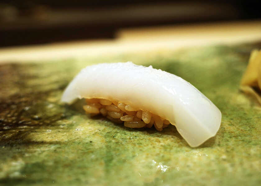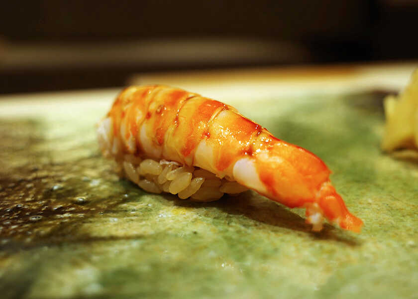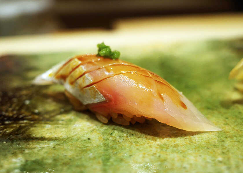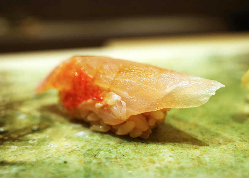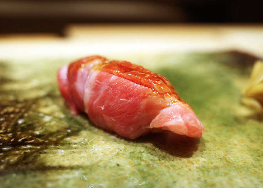 最初に握られたのは〈やま幸〉から仕入れた生鮪。〈やま幸〉は豊洲の初競りで一番鮪を5年連続落札している有名鮪仲卸で、そのクオリティは折り紙付き。腹上の大トロで、脂が最も乗っていて口中でとろける。