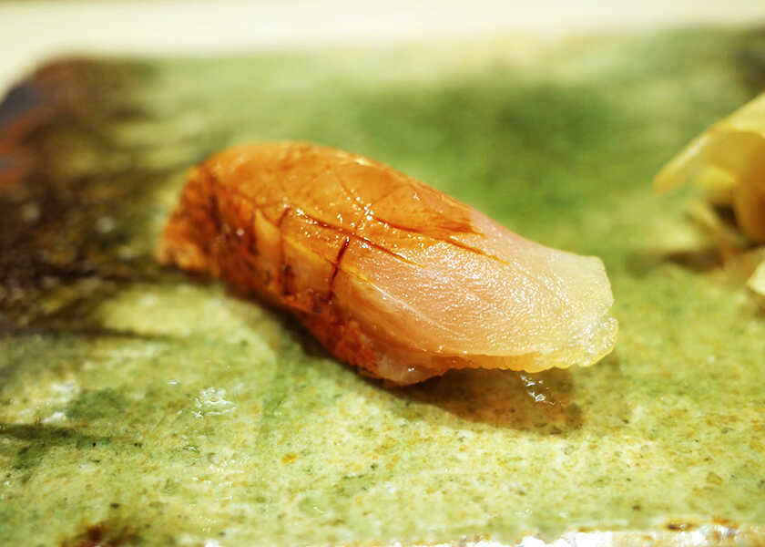 握りはおまかせで11貫が握られる。東京都江東区新木場にある〈横井醸造〉の7年熟成の赤酢をブレンドした赤シャリで、とてもまろやかな味わい。鉄釉陶器のゲタの乙な緑の上で、鮨ネタがよく映える。